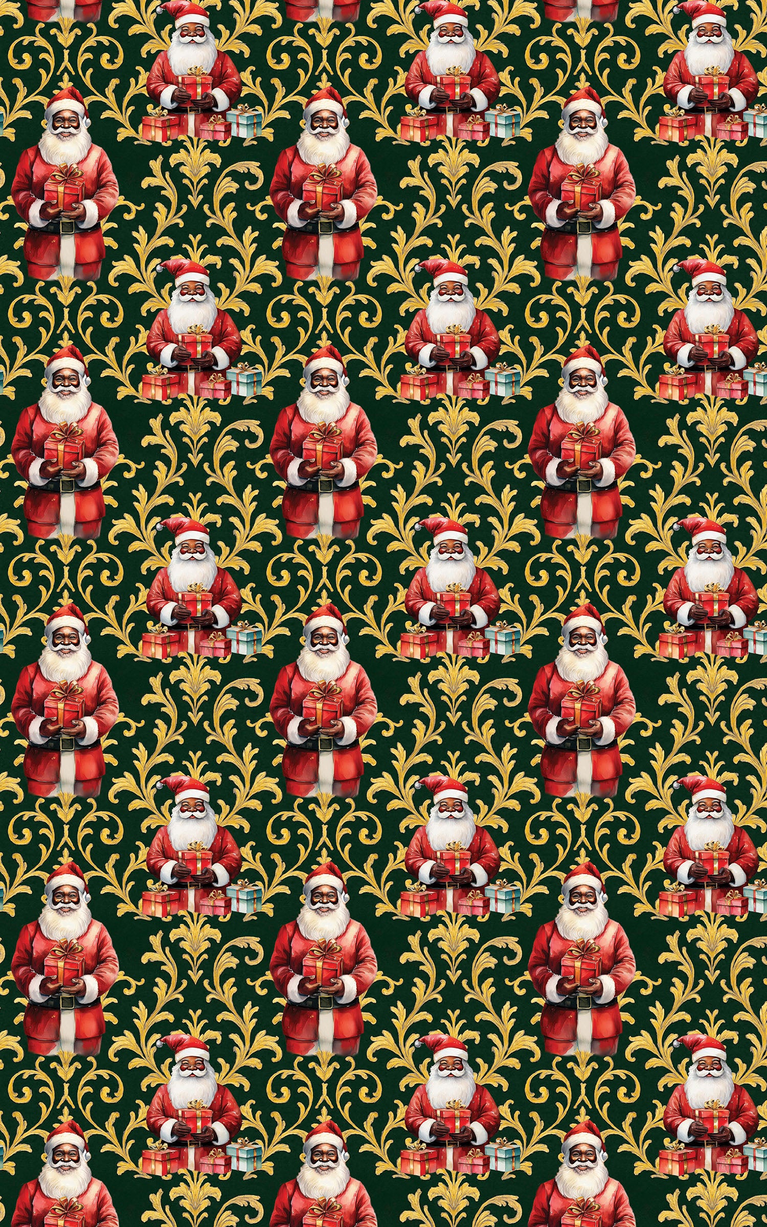 Santa’s dressed to impress in a swirl of deep navy and shining gold, bringing holiday grandeur with every step. Holding a gleaming gift wrapped in metallic tones, this regal pattern captures the magic of Christmas at its most elegant. Perfect for wrapping presents that deserve a touch of luxury and sparkle this season—because Santa’s not just delivering joy, he’s delivering it in style.