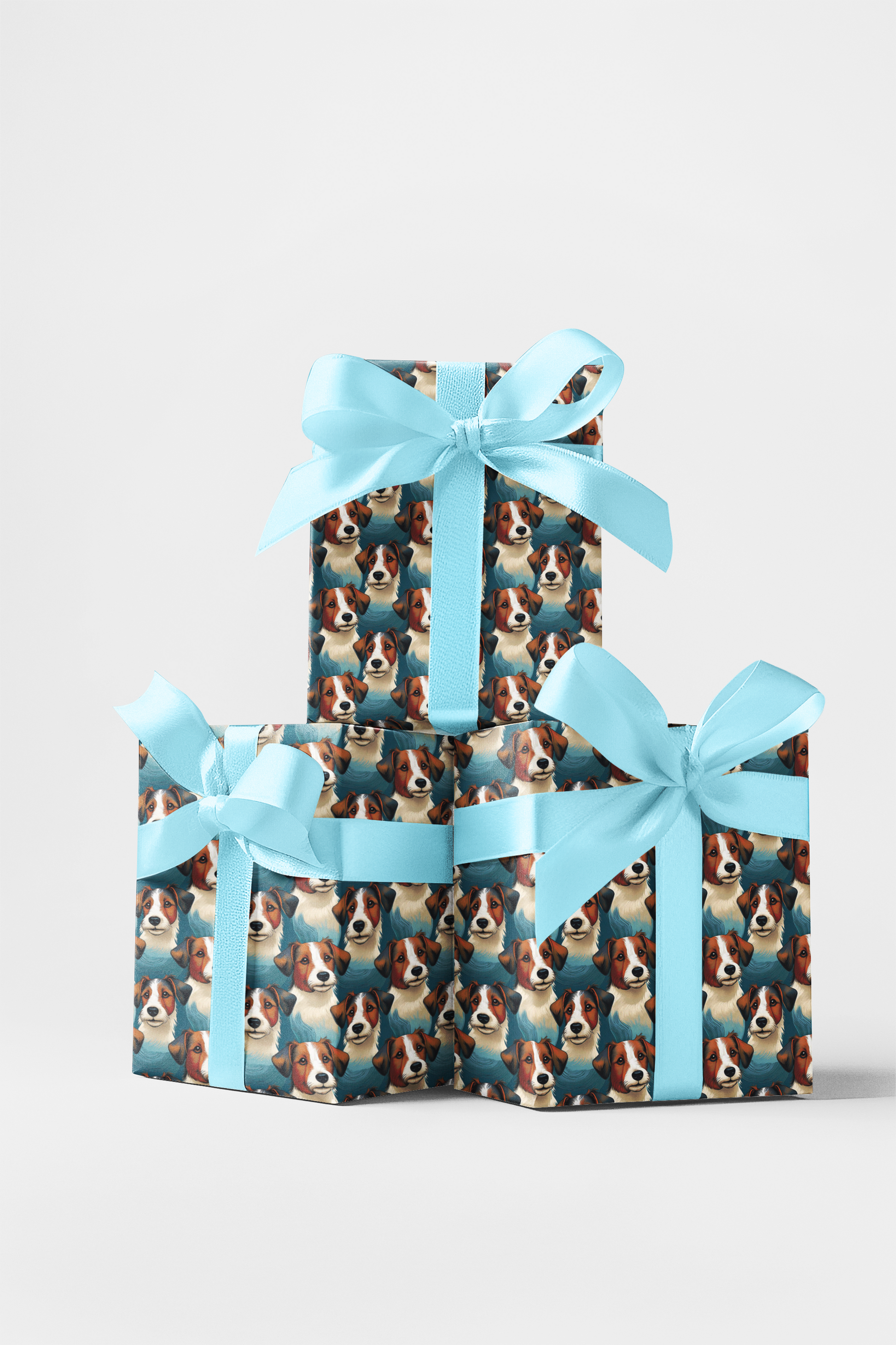 Celebrate the lively charm of Jack Russell Terriers! This cheerful wrap features adorable portraits against a playful blue and teal background, perfect for dog lovers. Ideal for birthdays, holidays, or pet-themed gifts, it adds a fun, heartwarming touch to every present.