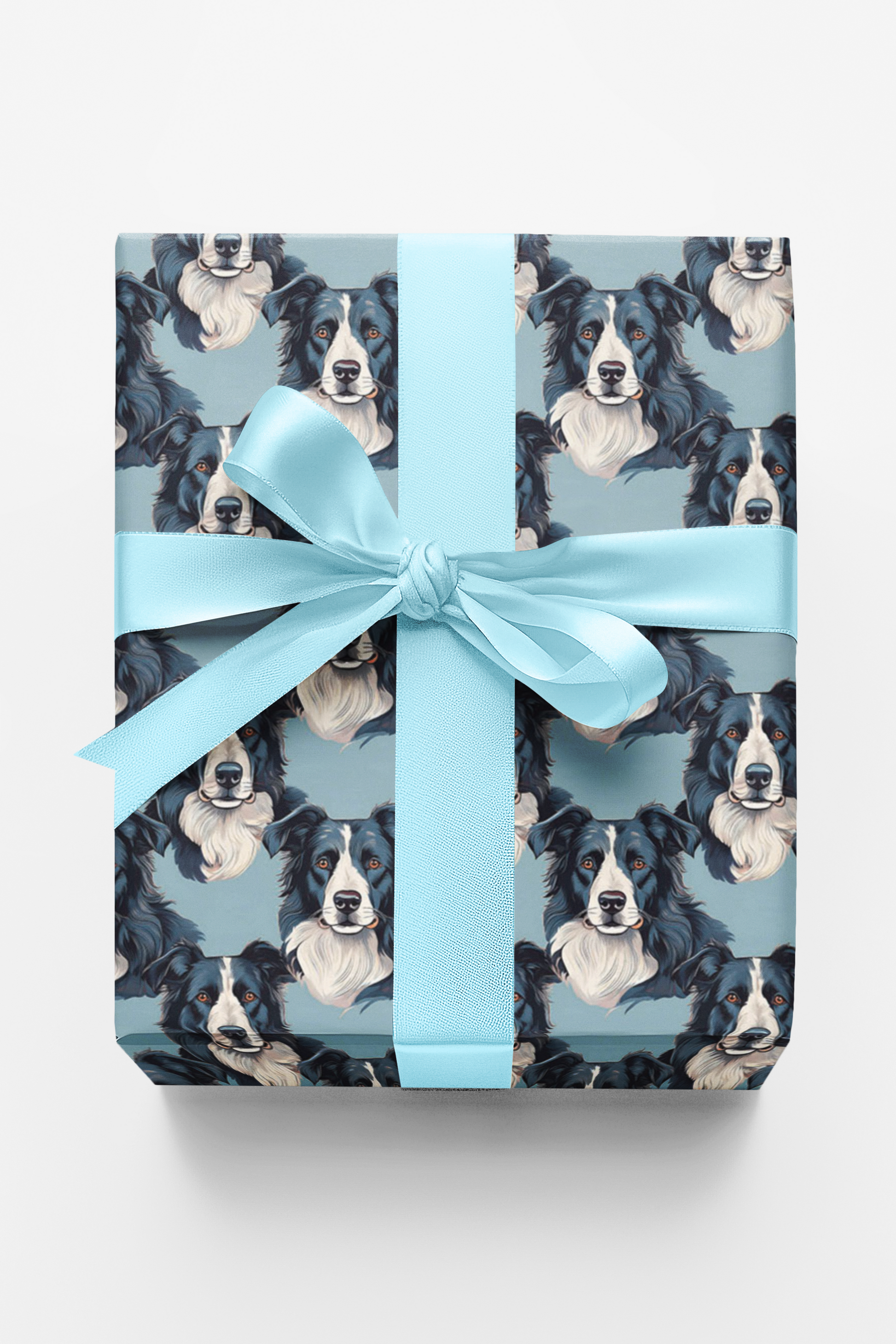 Celebrate the smart and loyal Border Collie with our The Border Collie Look wrapping paper! This charming design features playful Border Collies with their classic black-and-white coats and bright, focused expressions, set against a soft blue background. Perfect for dog lovers and Border Collie fans, this premium wrapping paper adds warmth, personality, and clever charm to any gift. Ideal for birthdays, special occasions, or simply making your present stand out.