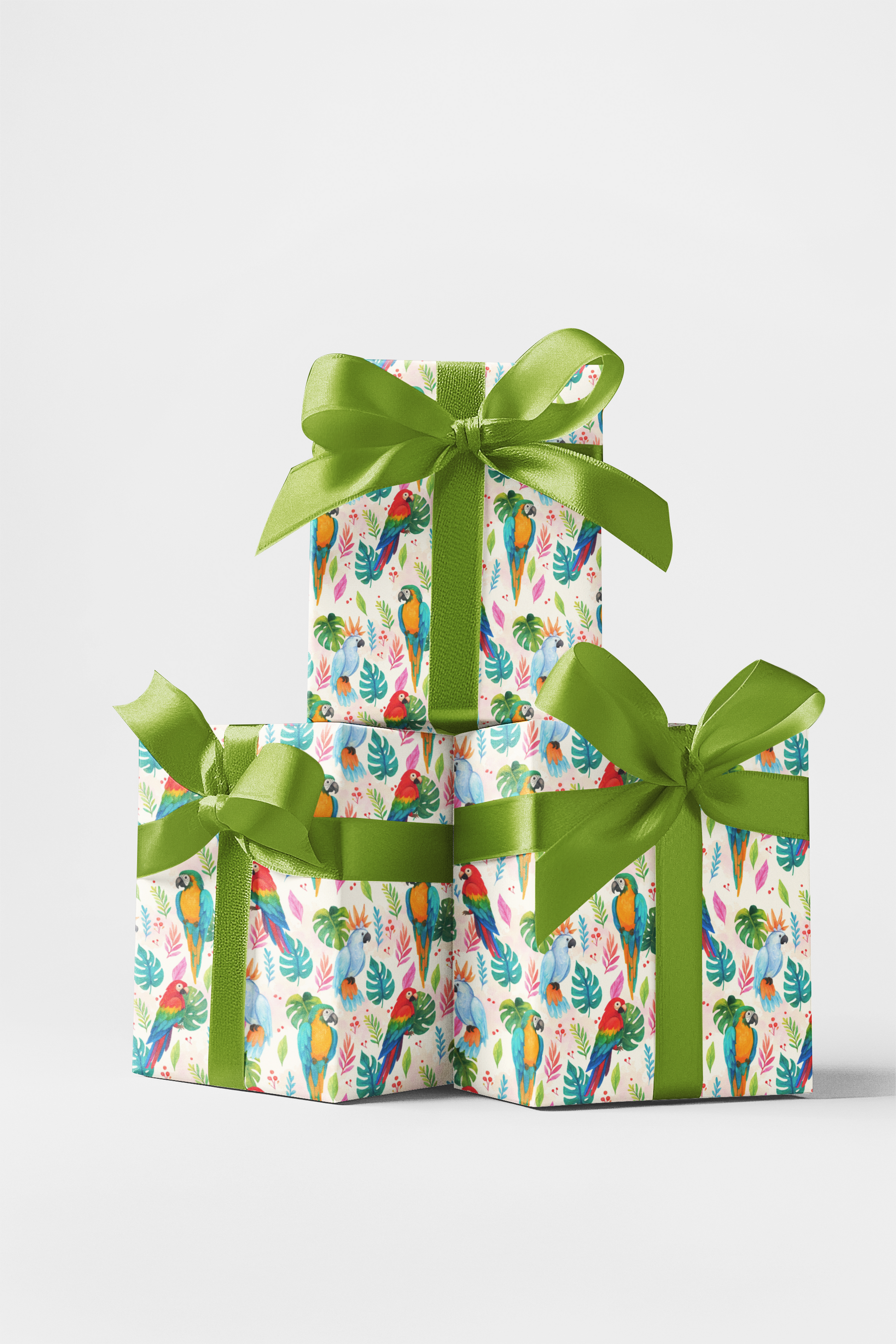 Celebrate the brilliance of the tropics with this vivid parrot design, where radiant feathers and lush botanical greenery come together in harmony. The interplay of rich color and delicate watercolor strokes captures the timeless elegance of nature in full bloom. Perfect for elevating any gift, this wrapping paper turns every present into a vibrant celebration of life and beauty.