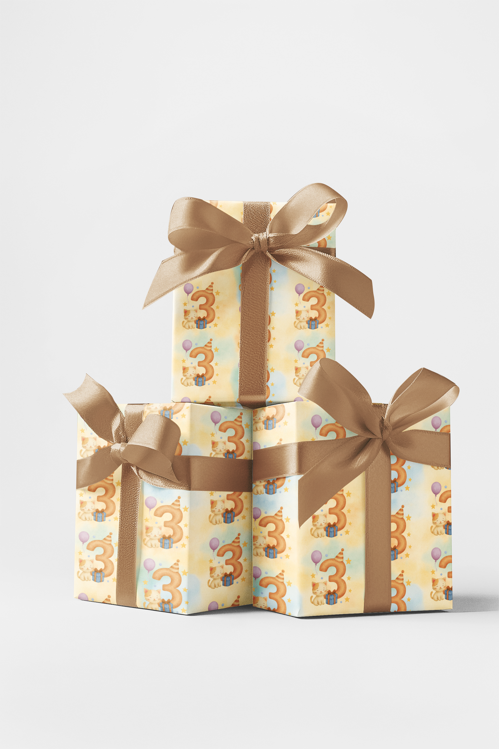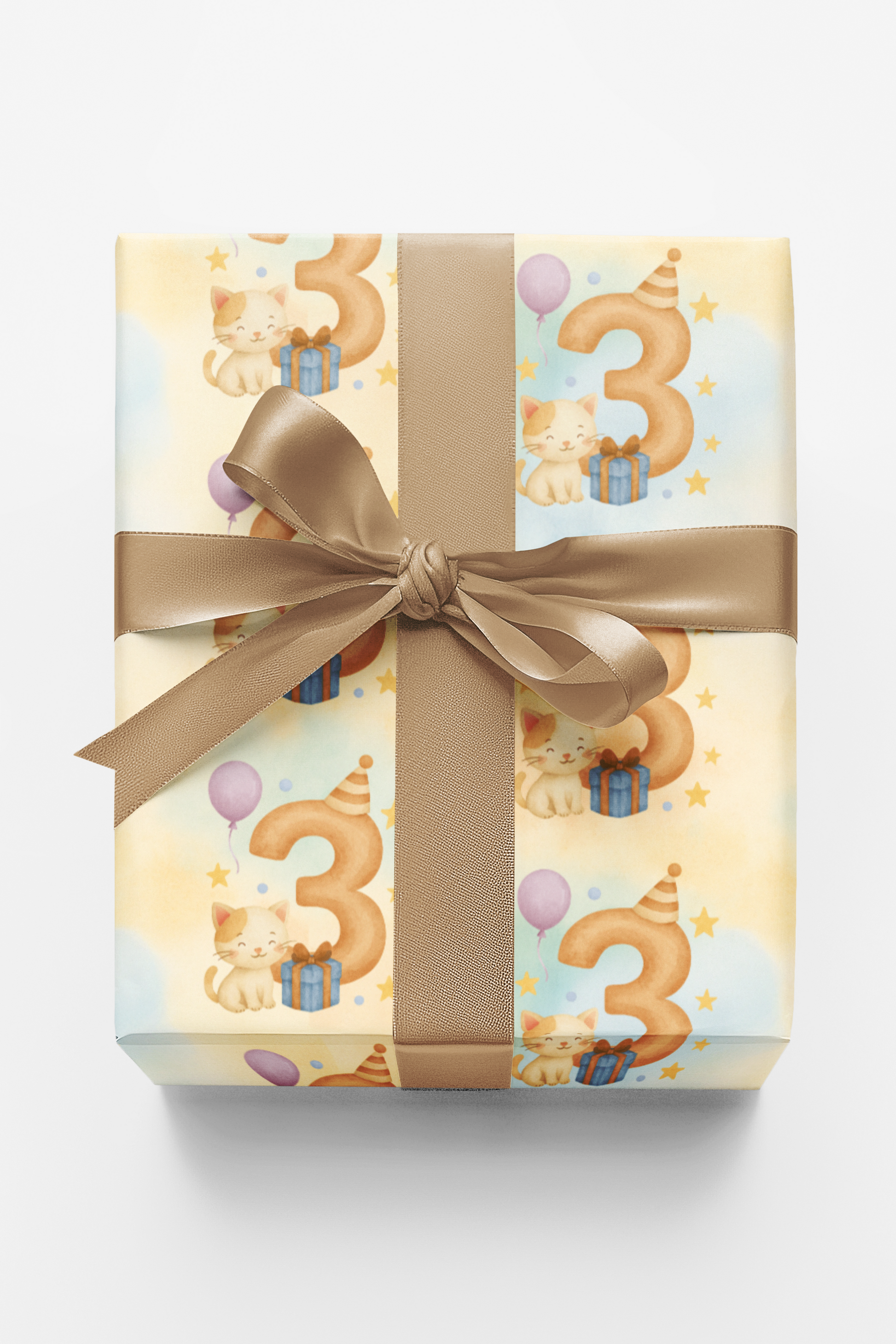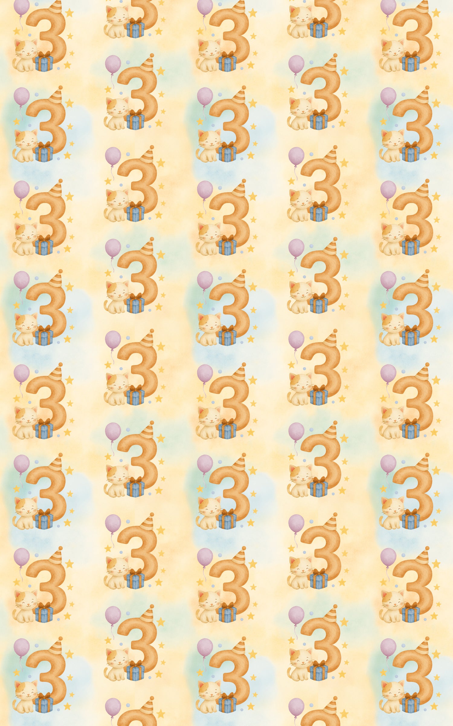 Three cheers for turning three! This playful pattern is purr-fect for your little one’s big day, featuring cuddly kittens, party hats, and gifts galore. With balloons and stars floating high, it’s a celebration wrapped in cuteness. Because being three isn’t just a number—it’s the start of endless giggles, birthday magic, and triple the fun!
