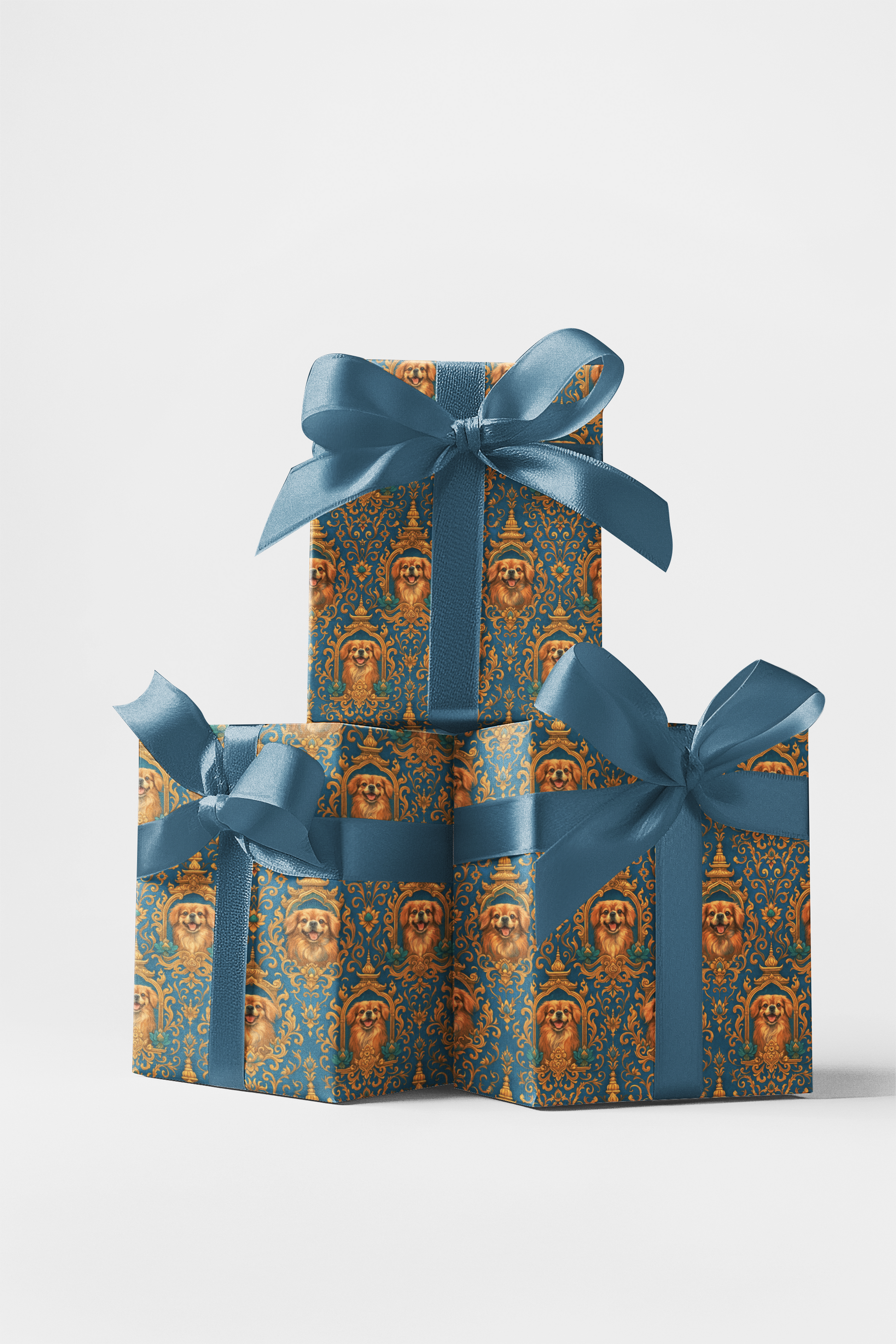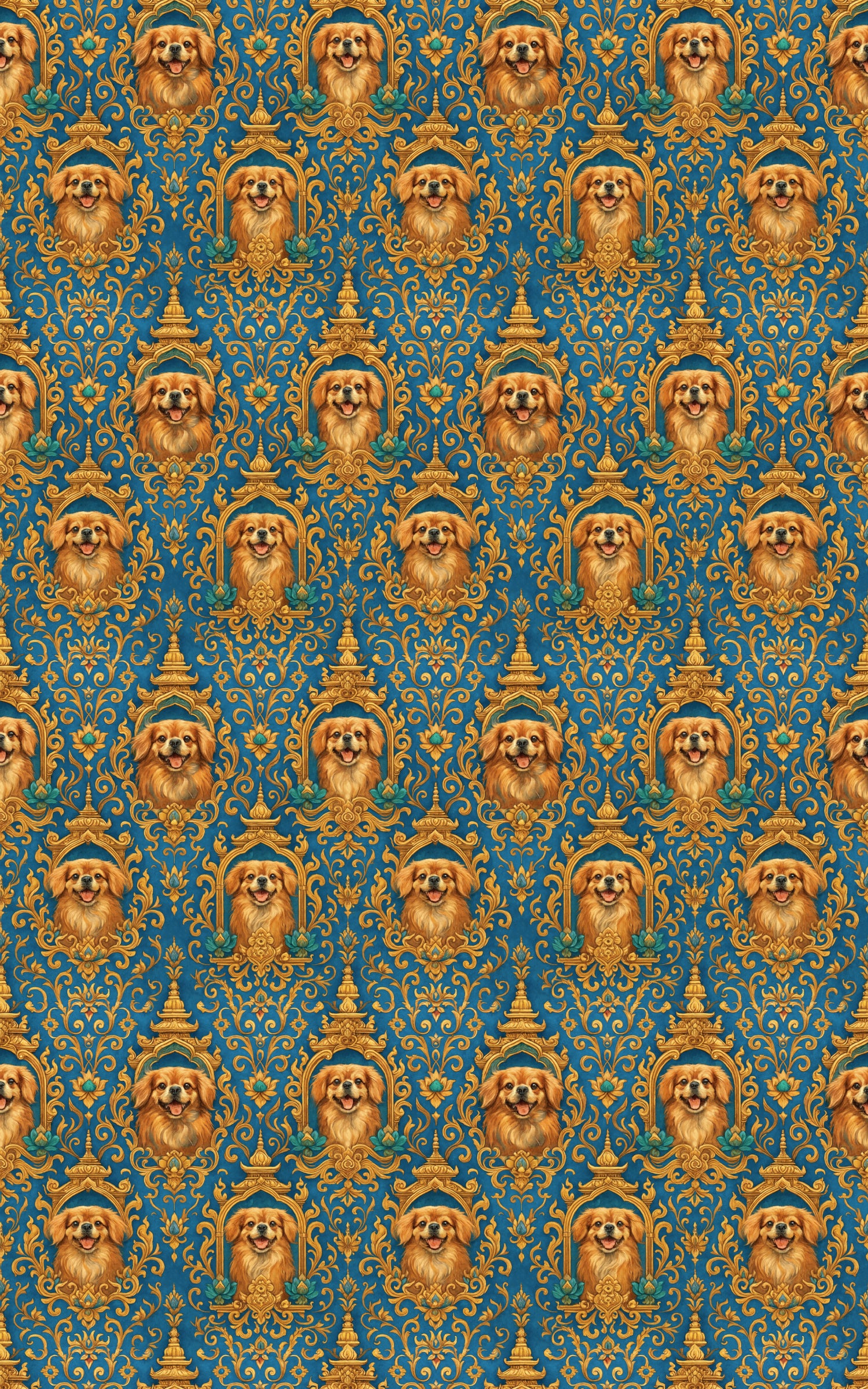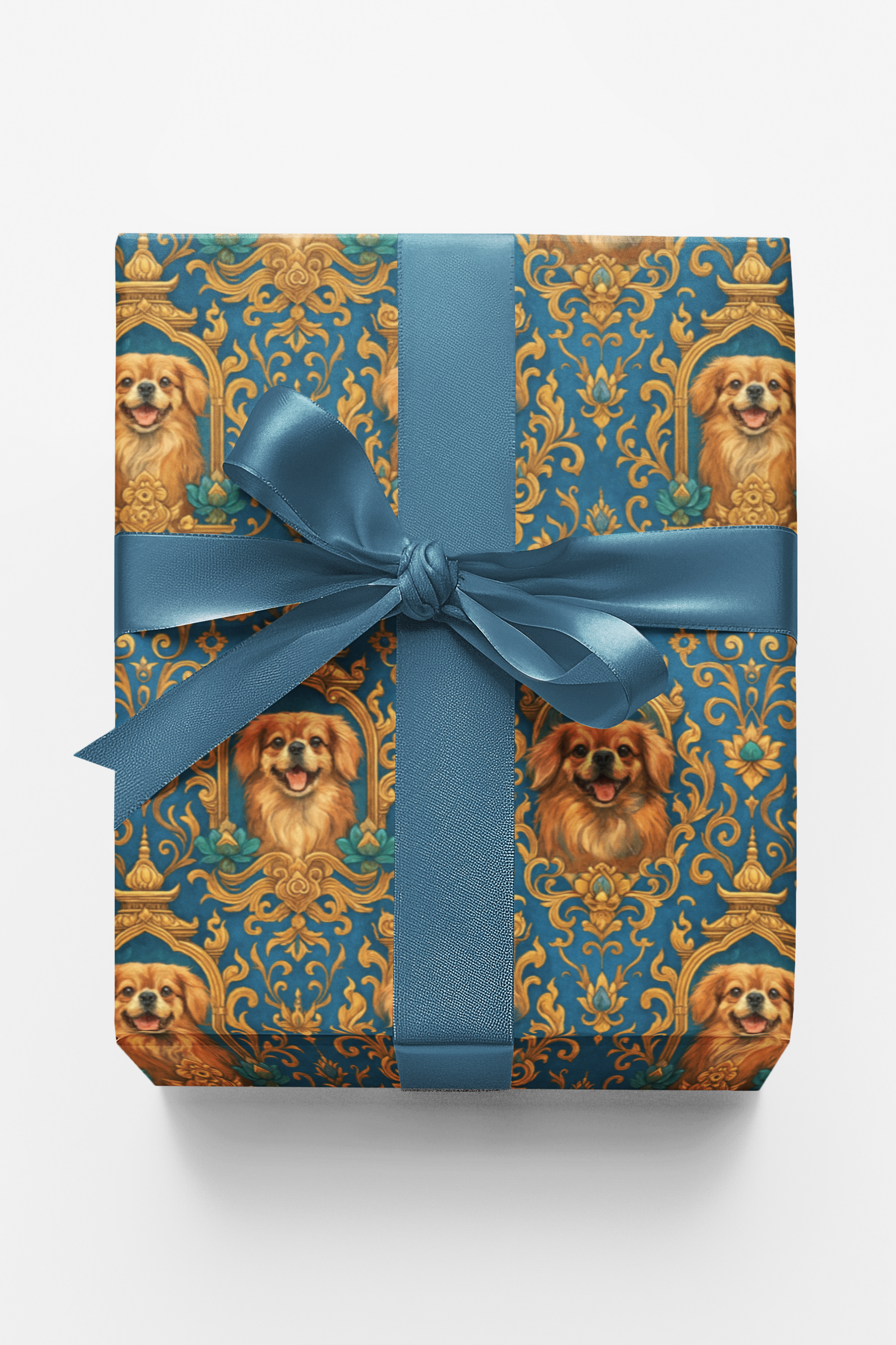 Luxurious and majestic, Tibetan Temple Tapestry celebrates timeless artistry with a regal palette of deep sapphire and gold. Intricately detailed with ornate flourishes and charming Tibetan spaniels framed in gilded motifs, this design evokes the grandeur of ancient temples and treasured tapestries. Perfect for elegant gifting, holiday celebrations, or anyone who loves a touch of opulence.