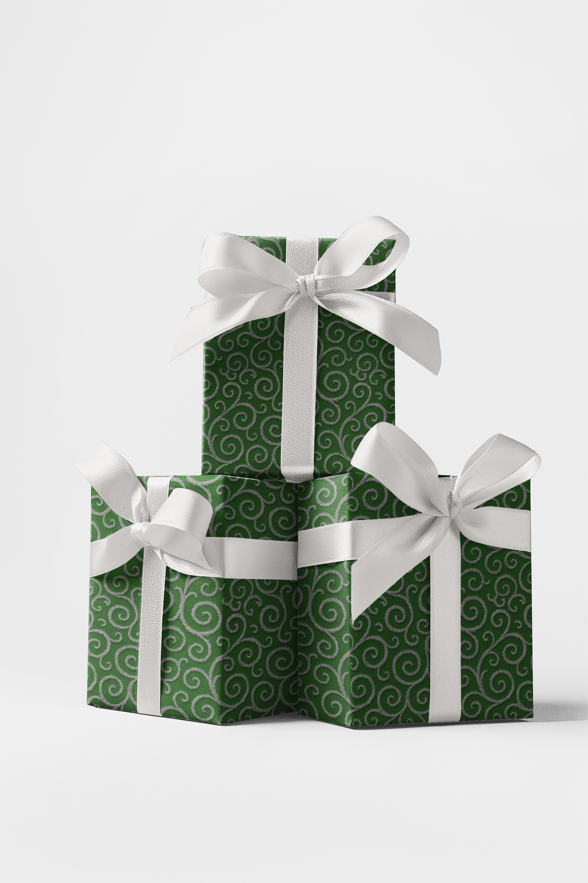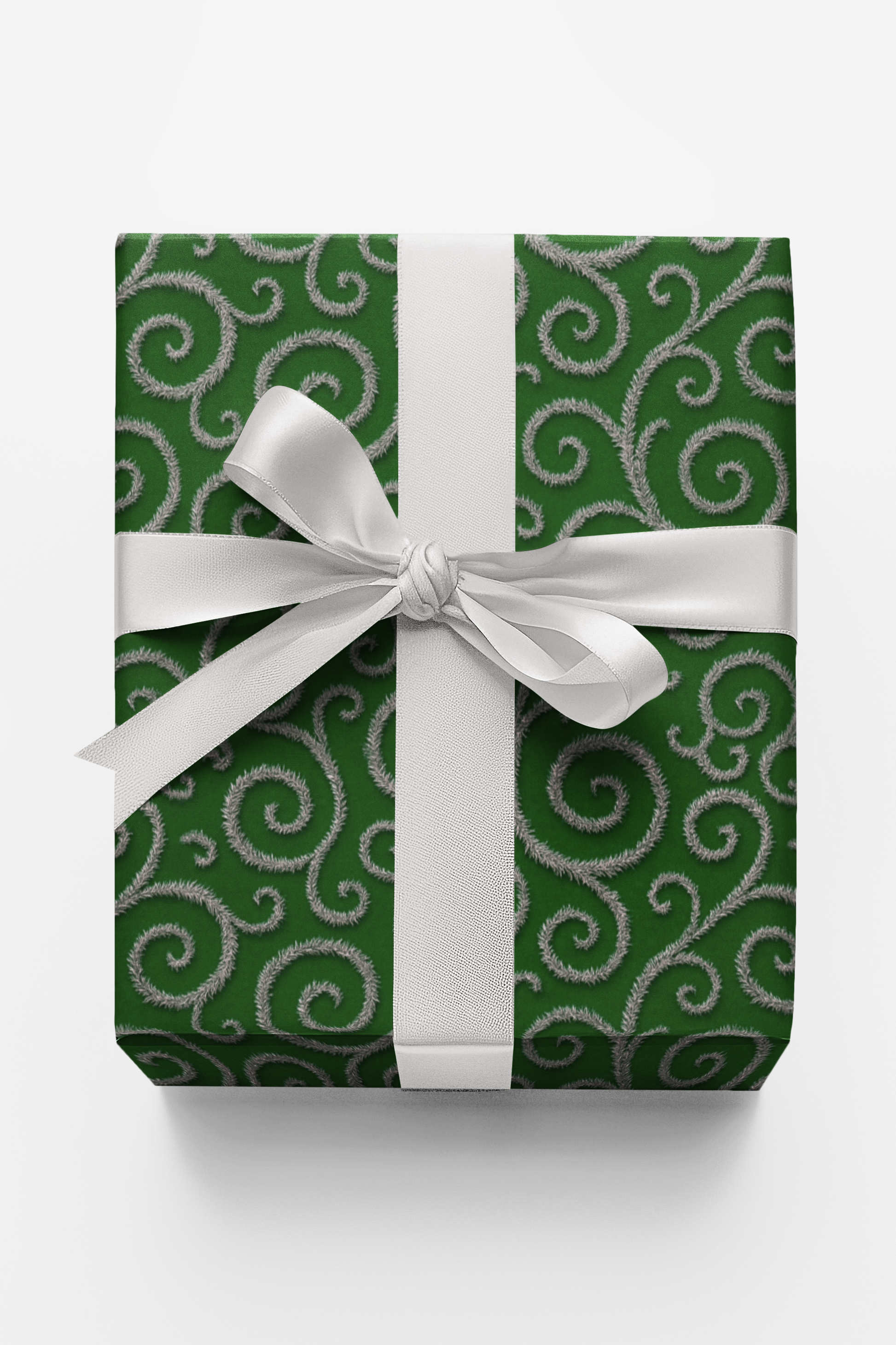 A dance of silver swirls unfurls across a deep evergreen backdrop, like festive magic captured in motion. Each curling line shimmers with a frosted glow, evoking the charm of winter mornings and the sparkle of holiday décor. This design celebrates joyful elegance and timeless whimsy—where every loop feels like a ribbon of cheer, and every glance reveals the enchanting spirit of a season wrapped in wonder.
