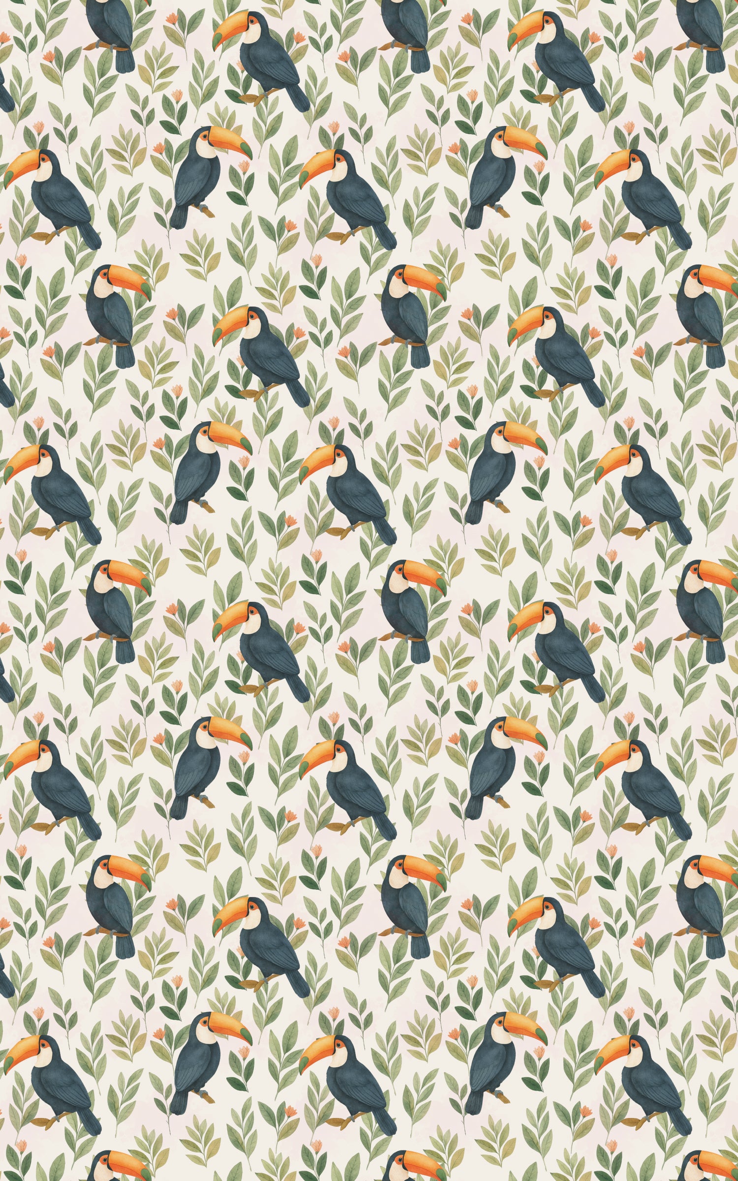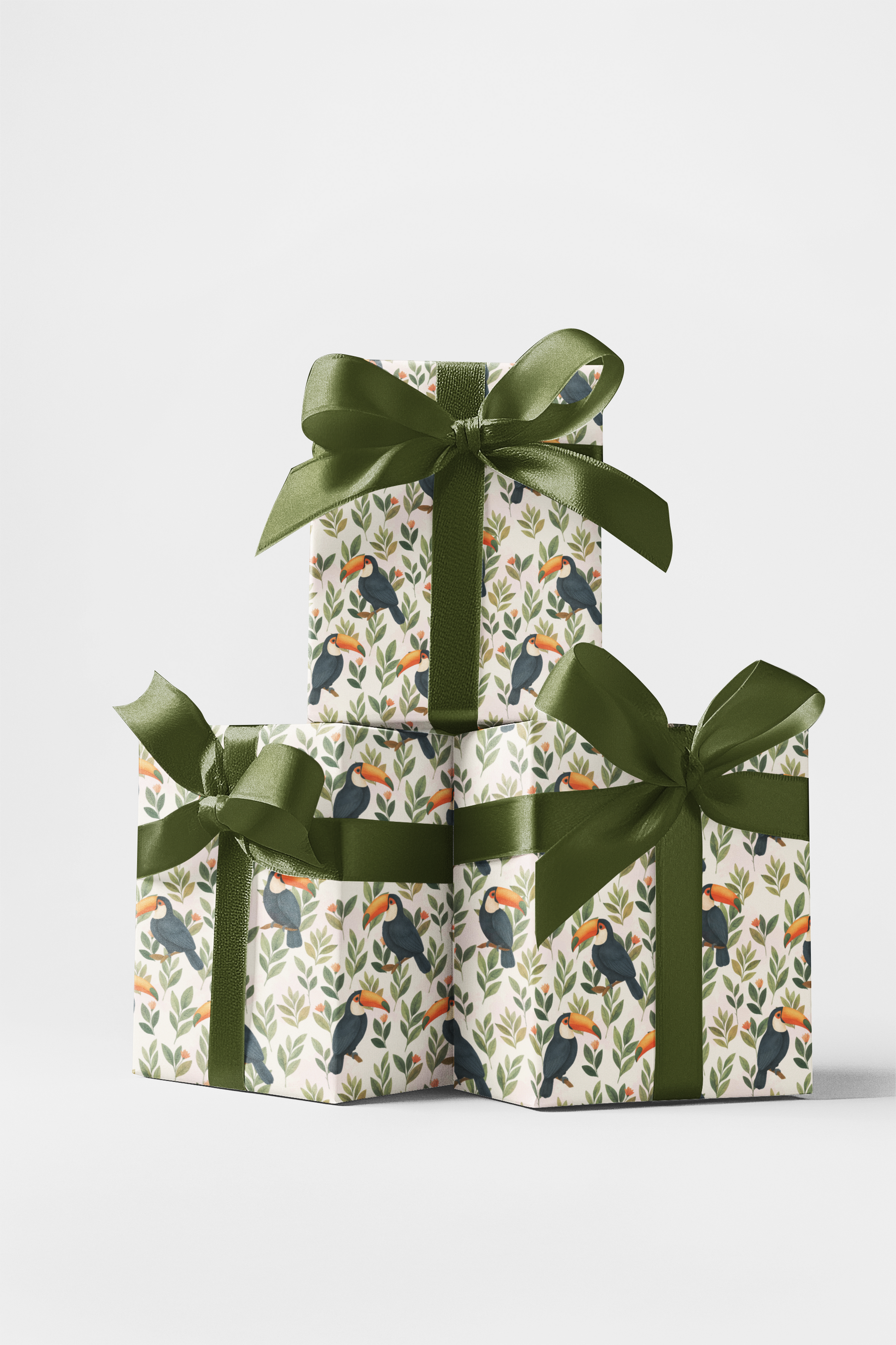 Bring the serene beauty of the tropics into your everyday gifting. This design celebrates the natural harmony of lush green foliage and striking toucans, their vivid beaks adding a refined touch of color against a backdrop of tranquil leaves. Perfect for those who appreciate elegance rooted in the artistry of nature, this wrapping paper transforms every gift into a piece of tropical poetry.