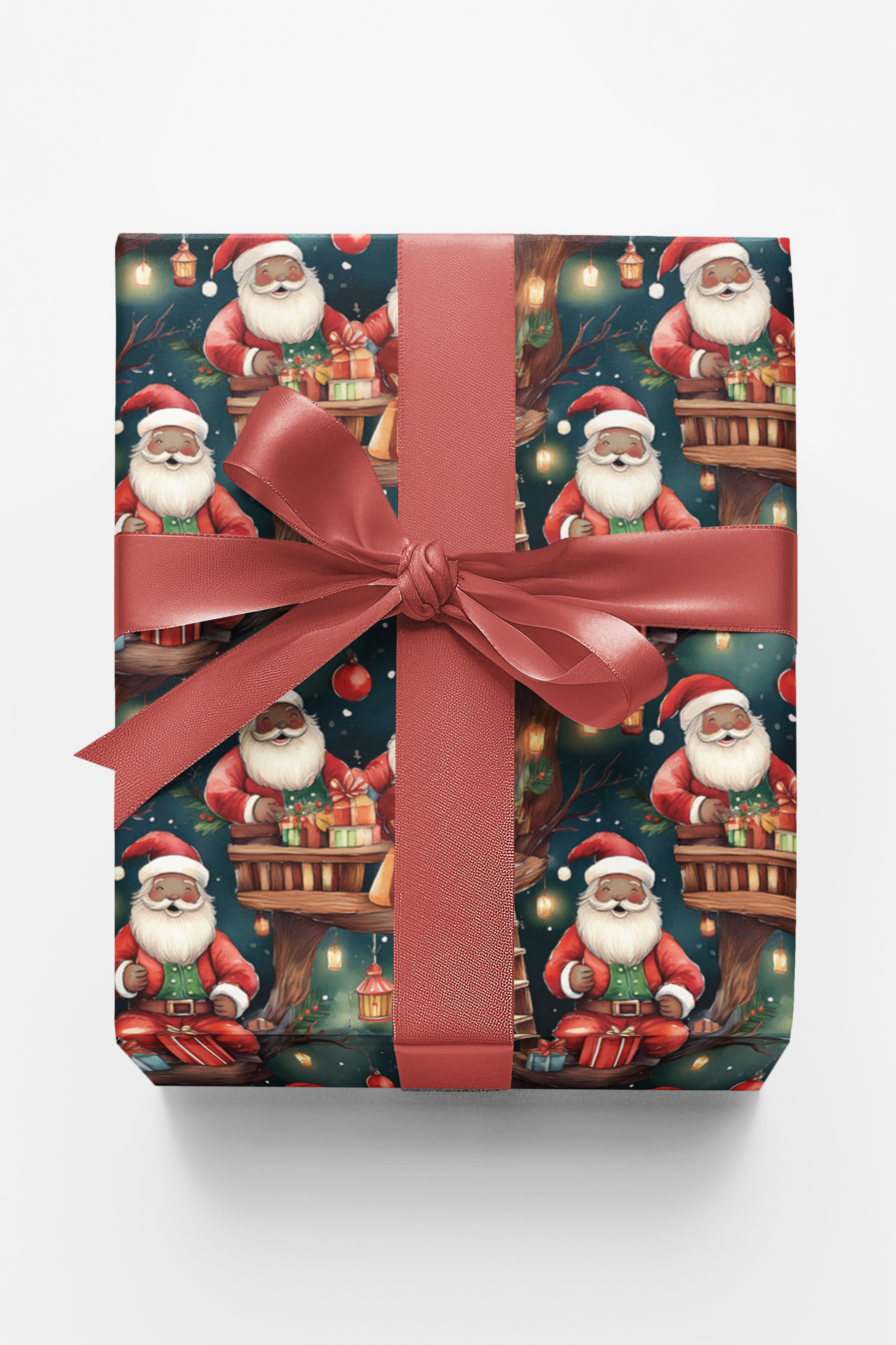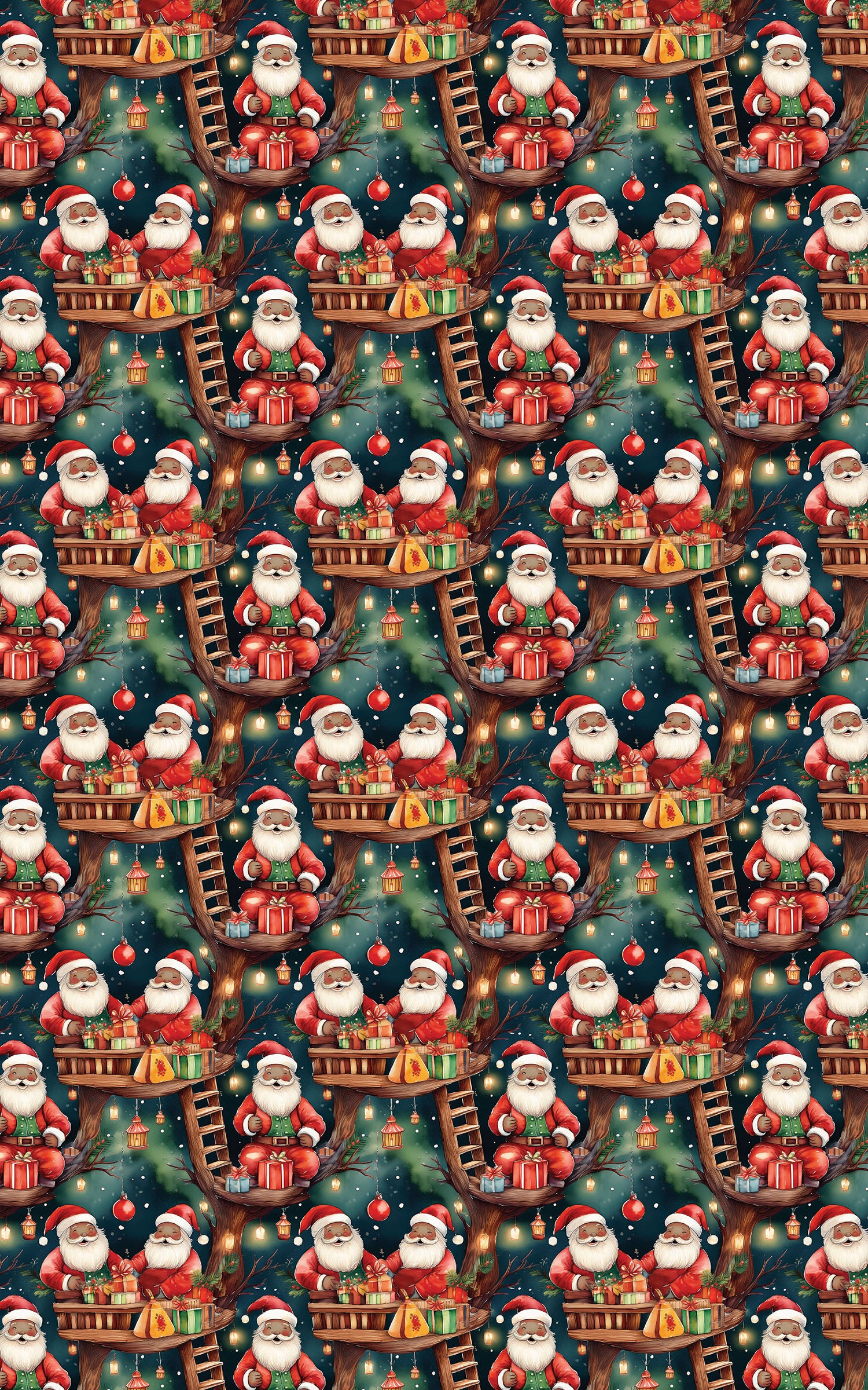 Santa’s swapped the sleigh for a cozy tree fort, strung with twinkling lights and overflowing with gifts that tumble from the branches. This playful pattern captures the wonder of Christmas hideaways—part clubhouse, part holiday magic. Perfect for wrapping presents that deserve a sense of adventure and surprise this season. Because let’s face it—Santa’s not just delivering joy, he’s turning every tree into a treasure trove!