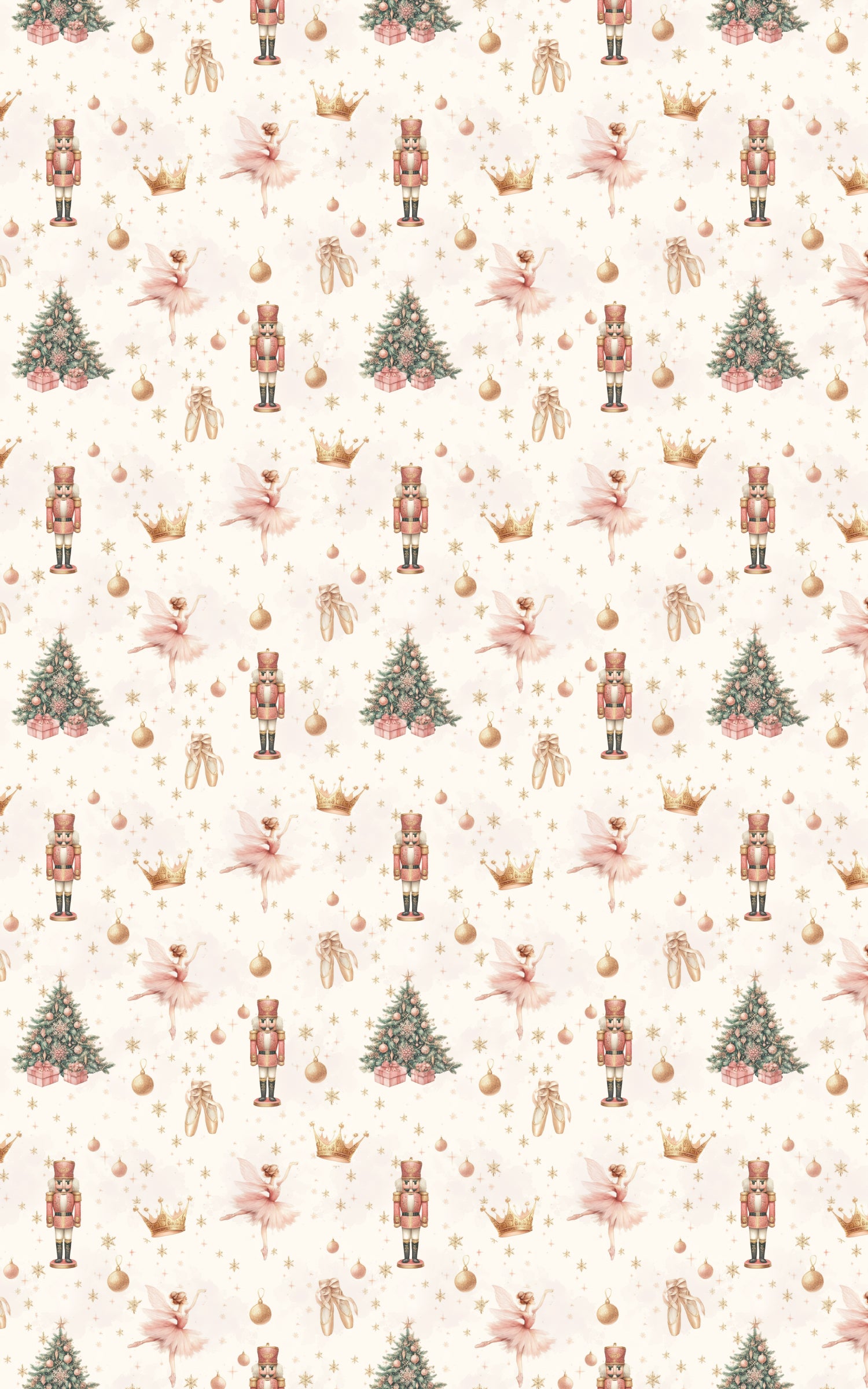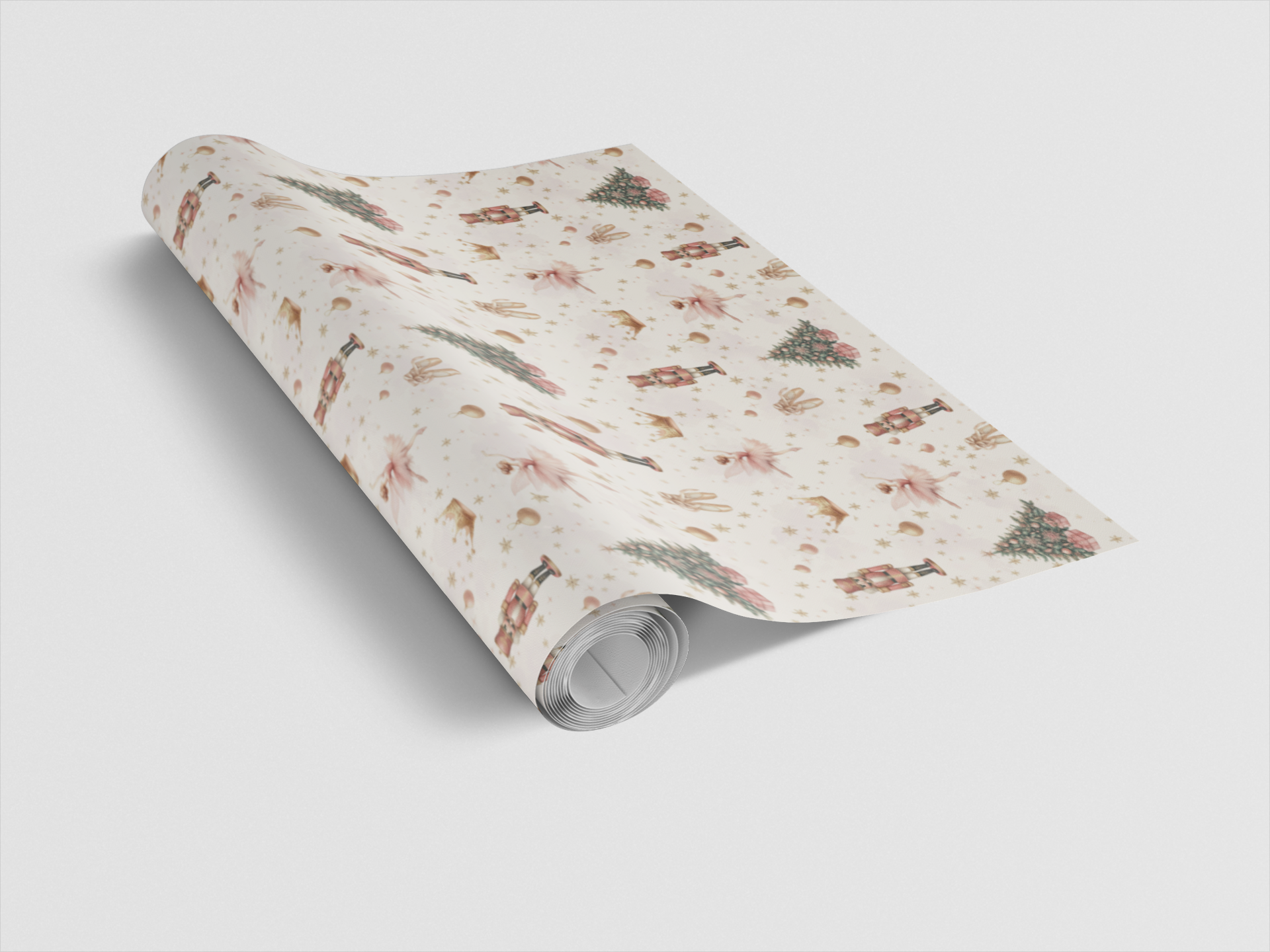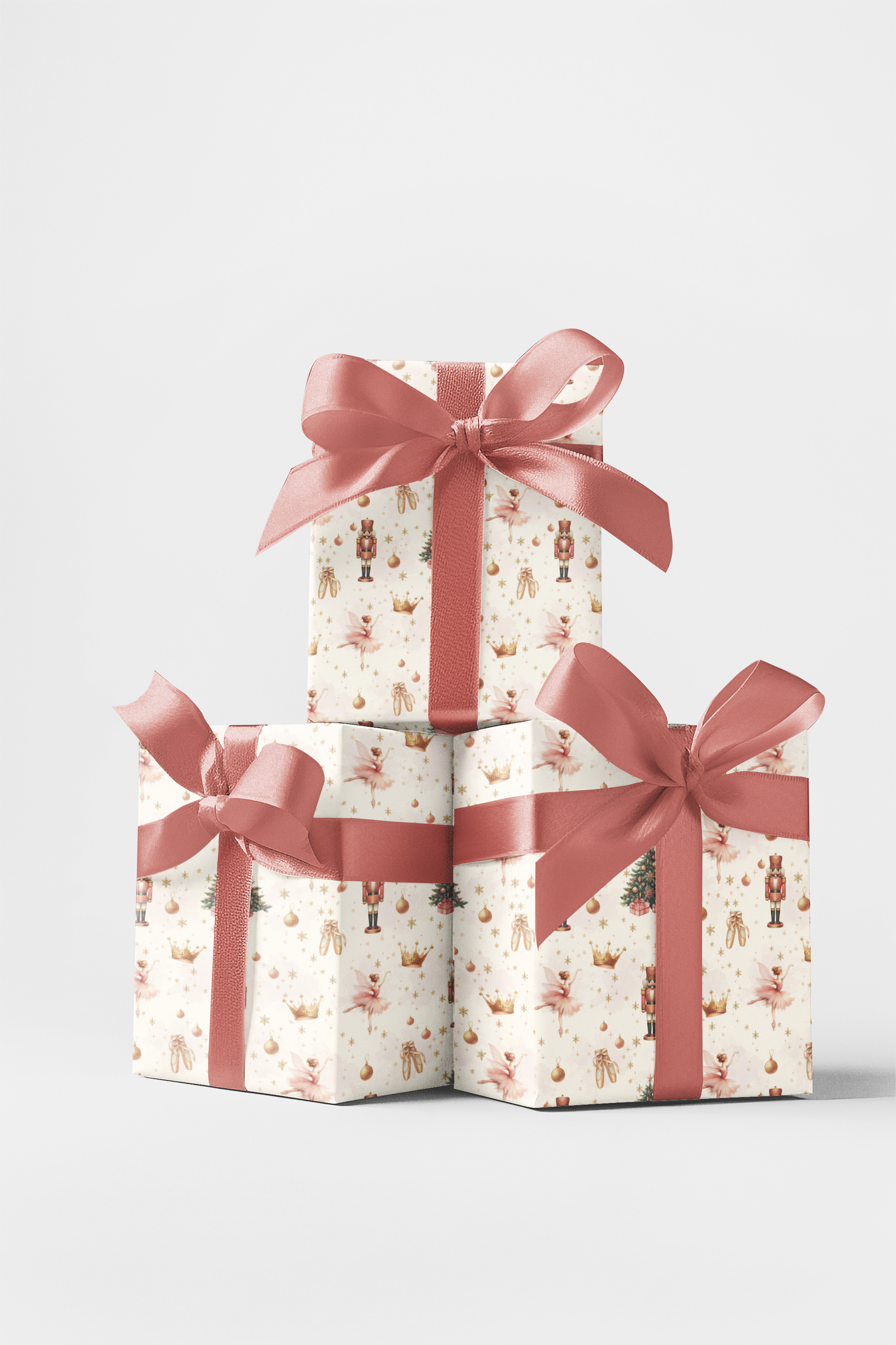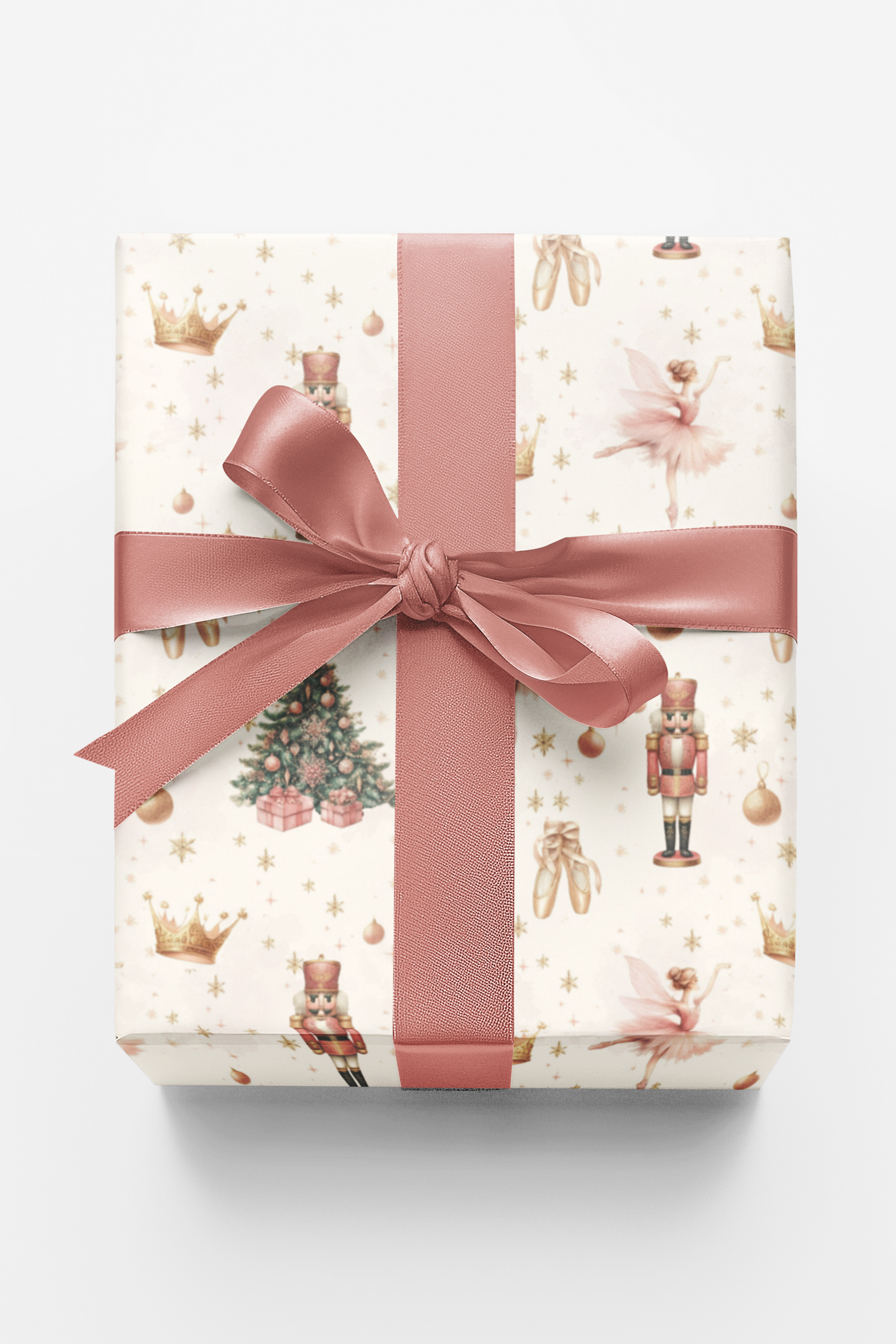 Wrapped in a waltz of wonder, Ballet Dreams pirouettes through a world of soft pinks, golden crowns, and twinkling stars. Toy soldiers stand at elegant attention while graceful ballerinas twirl amid shimmering ornaments and evergreens dusted with magic. Each fold tells a story of festive fantasy and timeless grace—a dance between nostalgia and sparkle. This design captures the heart of the holidays with poise and playfulness, where every gift becomes a stage for enchantment.