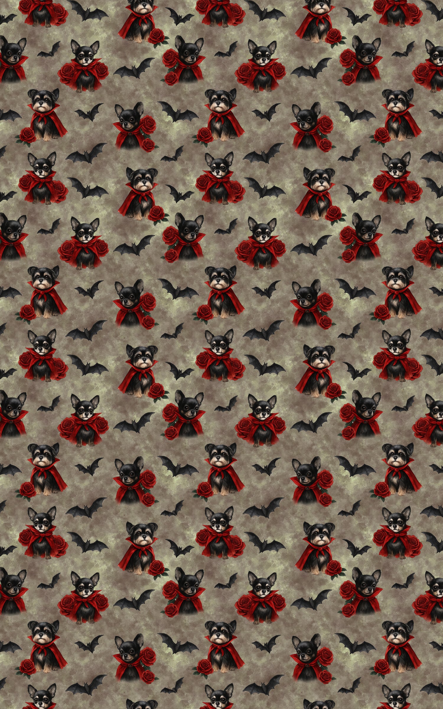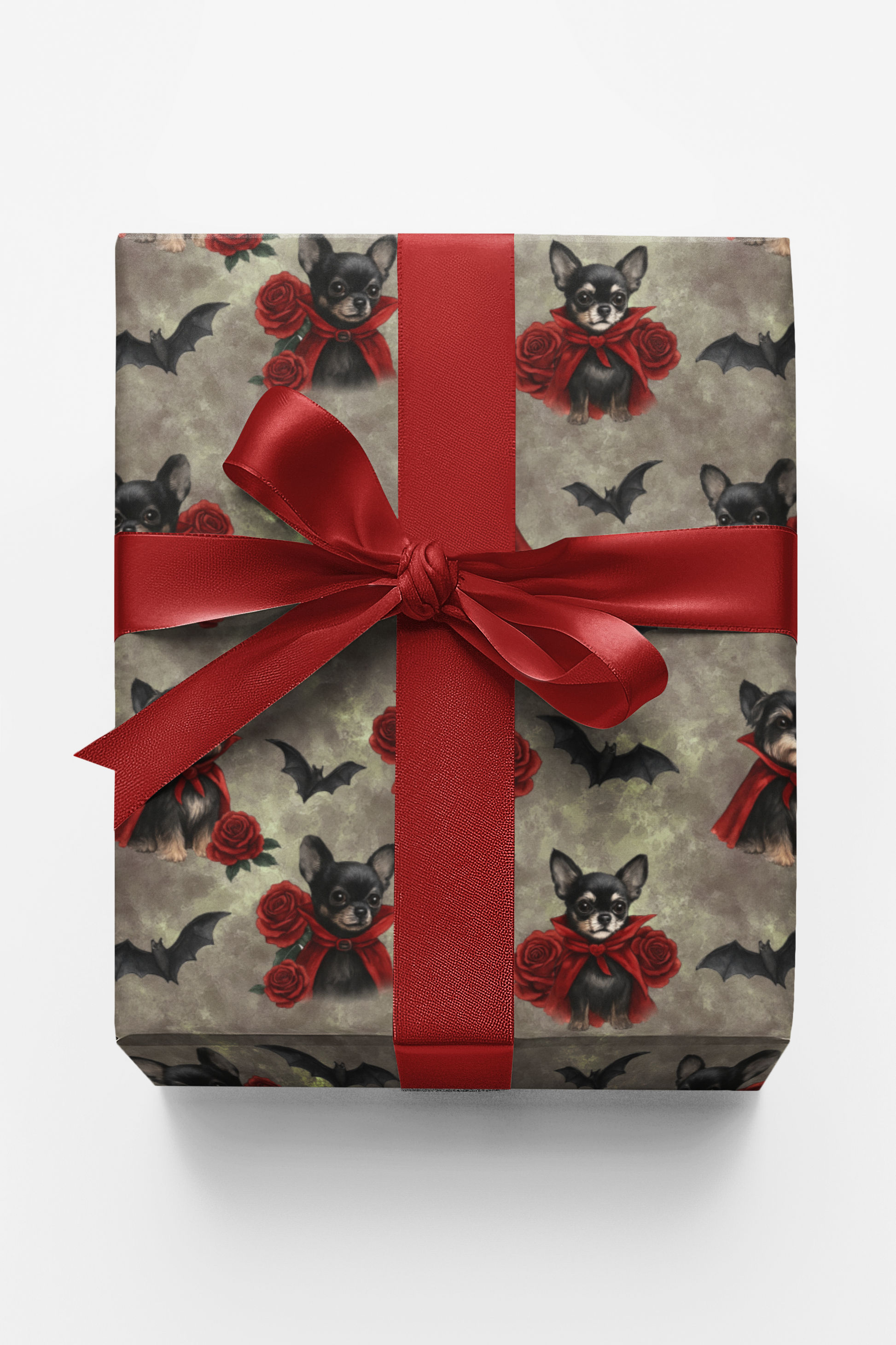 Wrap your gifts in a touch of gothic charm with this bewitching design. Featuring dapper pups dressed in crimson vampire capes, surrounded by fluttering bats and deep red roses, this pattern strikes the perfect balance between eerie and enchanting. Ideal for Halloween parties, themed events, or anyone who loves a mix of spooky and stylish.