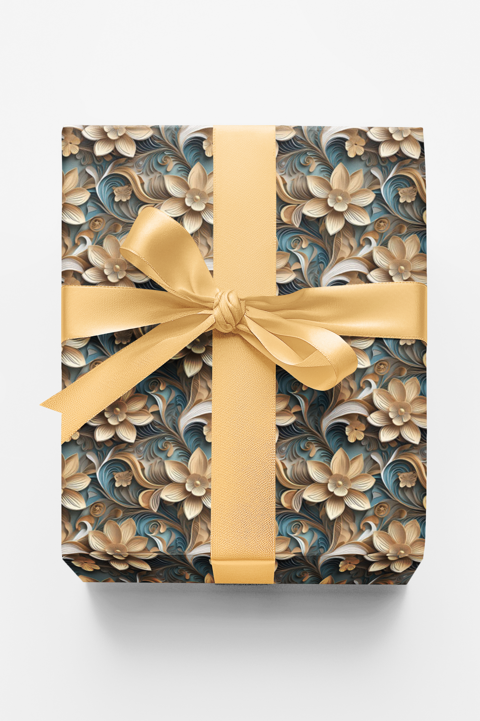 Soft golden florals and graceful blue flourishes create a timeless, refined aesthetic. A classic choice for weddings, anniversaries, and sophisticated wrapping.