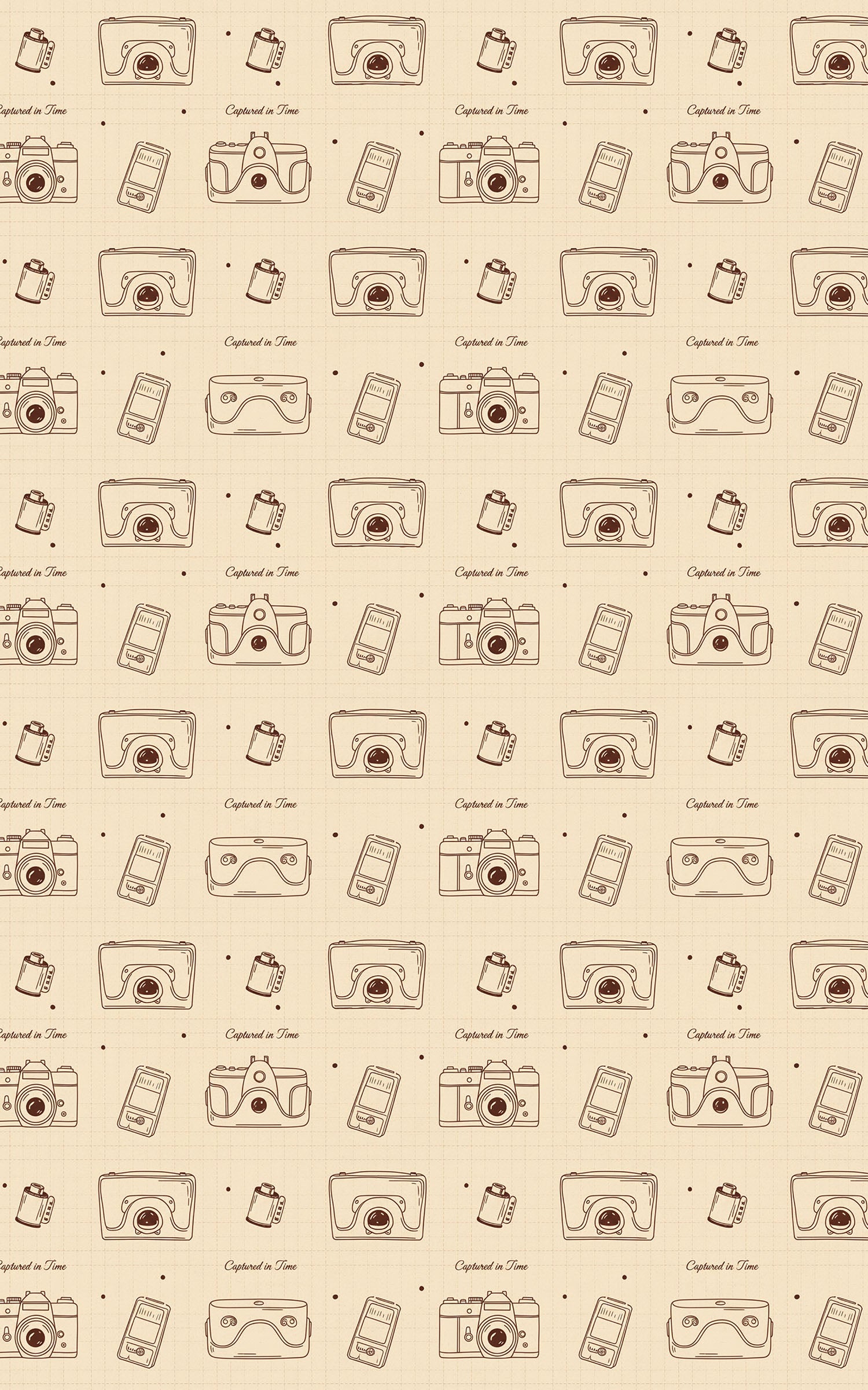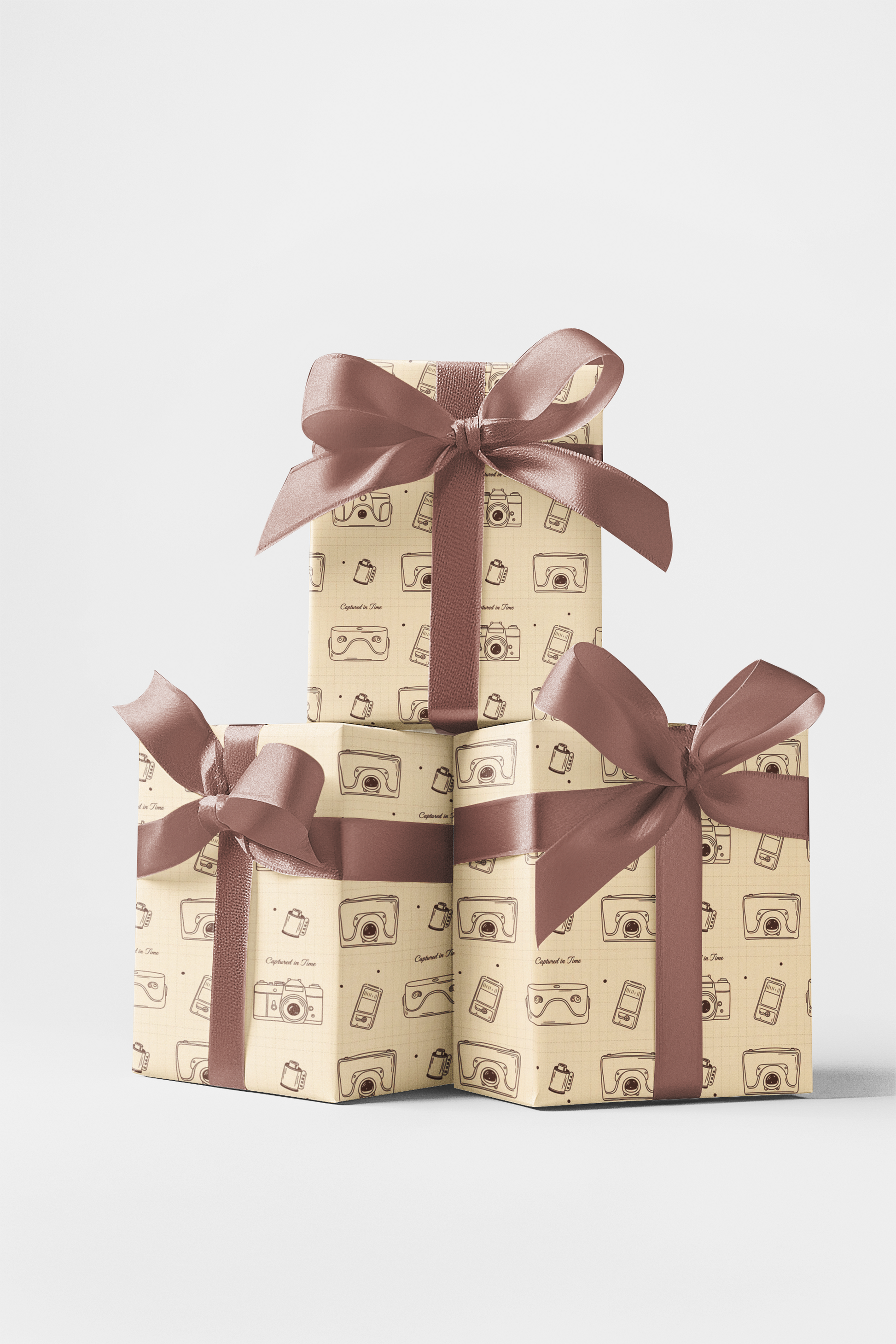 Capture a moment of nostalgia and style with our "Vintage Cameras" wrapping paper, ideal for photographers, tech enthusiasts, or anyone who appreciates retro aesthetics. This sophisticated design features a busy yet beautifully structured repeat of classic camera gear, including various analog camera styles, film canisters, and mobile phones, all set against a subtly gridded, warm buff background. The phrase "Captured in Time" is integrated as a script accent, reinforcing the theme of timeless memories and photography. The flat vector artwork uses a rich, monochromatic palette of deep sepia browns and warm golds, giving the overall look a refined, high-end, vintage appeal. Printed on our premium 90 GSM paper, this high-quality wrap ensures a luxurious and durable presentation for gifts like photo albums, tech gadgets, or collector's items.
