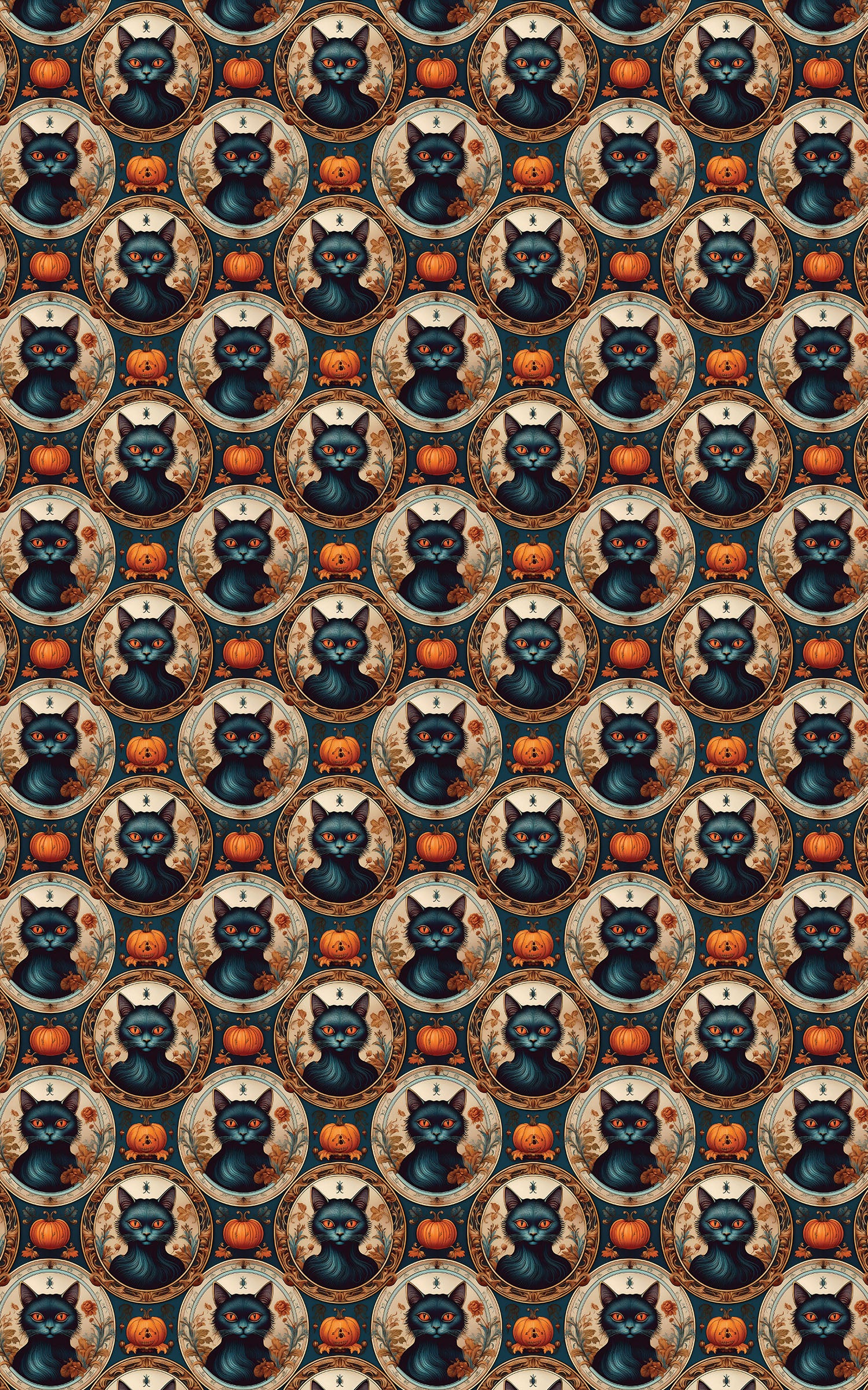 Wrap your ghostly gifts in antique charm with our Vintage Halloween Cameos wrapping paper! This elegant, seamless pattern features stylized portraits of mysterious black cats set within ornate, oval cameos. The pattern is richly detailed and includes small decorative pumpkins and autumnal floral accents. The sophisticated color palette of deep navy, burnt orange, and cream with gold accents gives the design a luxurious, spooky-Victorian feel. It is the perfect wrap for Halloween parties, fall birthdays, themed events, or for anyone who appreciates a classic, chic, and slightly eerie seasonal style.