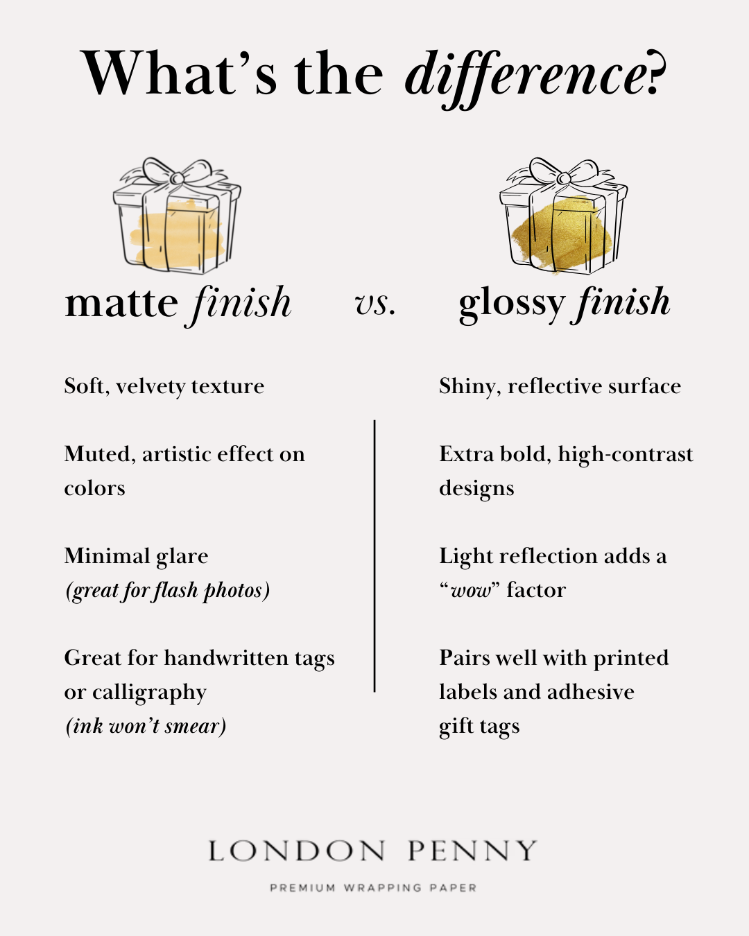 When selecting your wrapping paper, think about the mood you’d like to create. A matte finish brings a refined, understated elegance that feels timeless and sophisticated. It’s ideal for gifting when you want the design to feel soft, warm, and elevated—perfect for intimate occasions or when subtlety makes the statement.