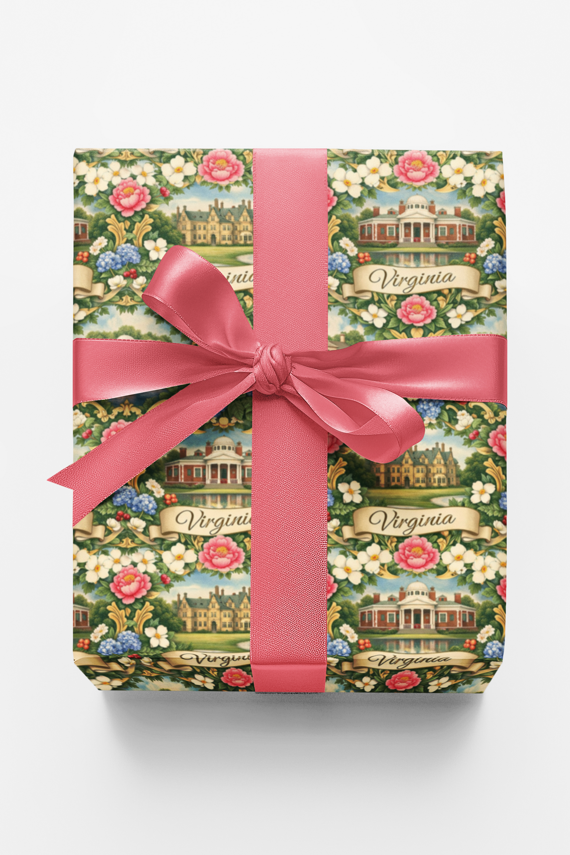 Blooming with history and refined charm, Virginia Colonial Garden unfolds like a stroll through a stately estate in full spring. Grand columned homes rise among climbing roses and lush greenery, while soft florals weave elegance into every scene. This design celebrates grace, heritage, and cultivated beauty—where tradition meets botanical splendor and every detail feels thoughtfully composed. Wrapping each gift in timeless sophistication, it carries the romance and poise of Virginia’s colonial gardens in full bloom.