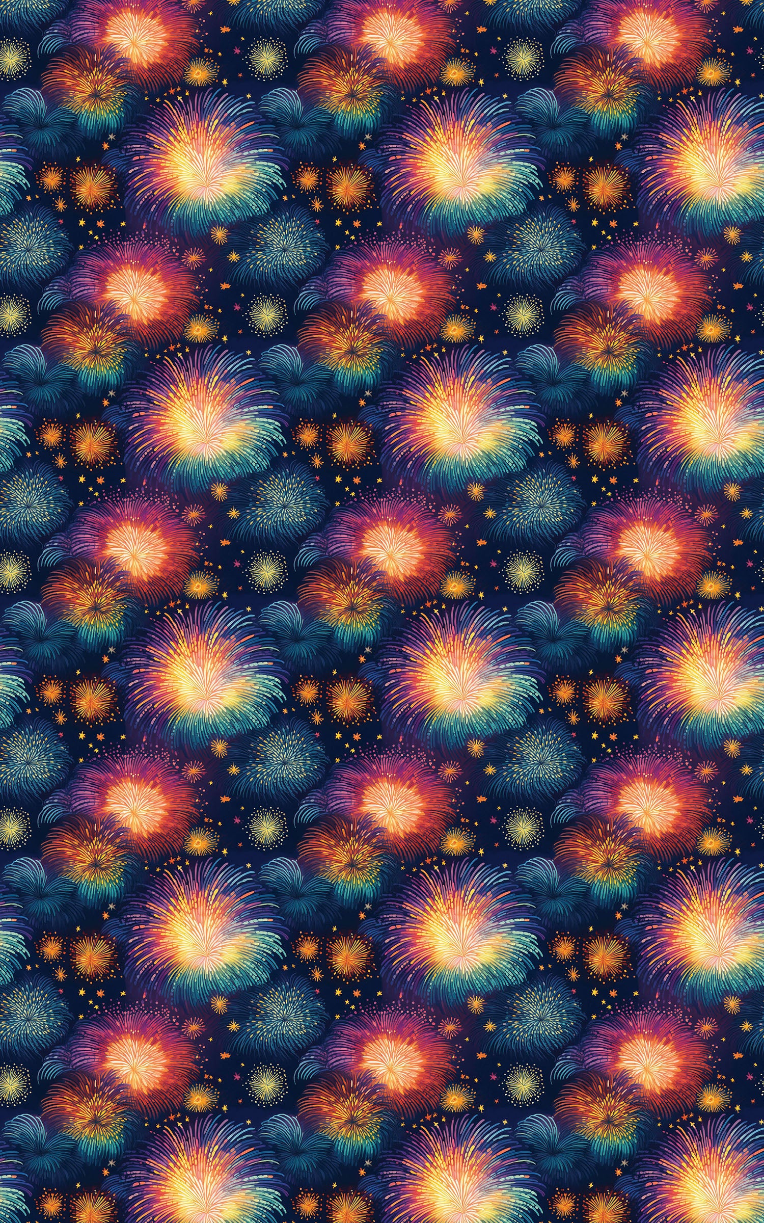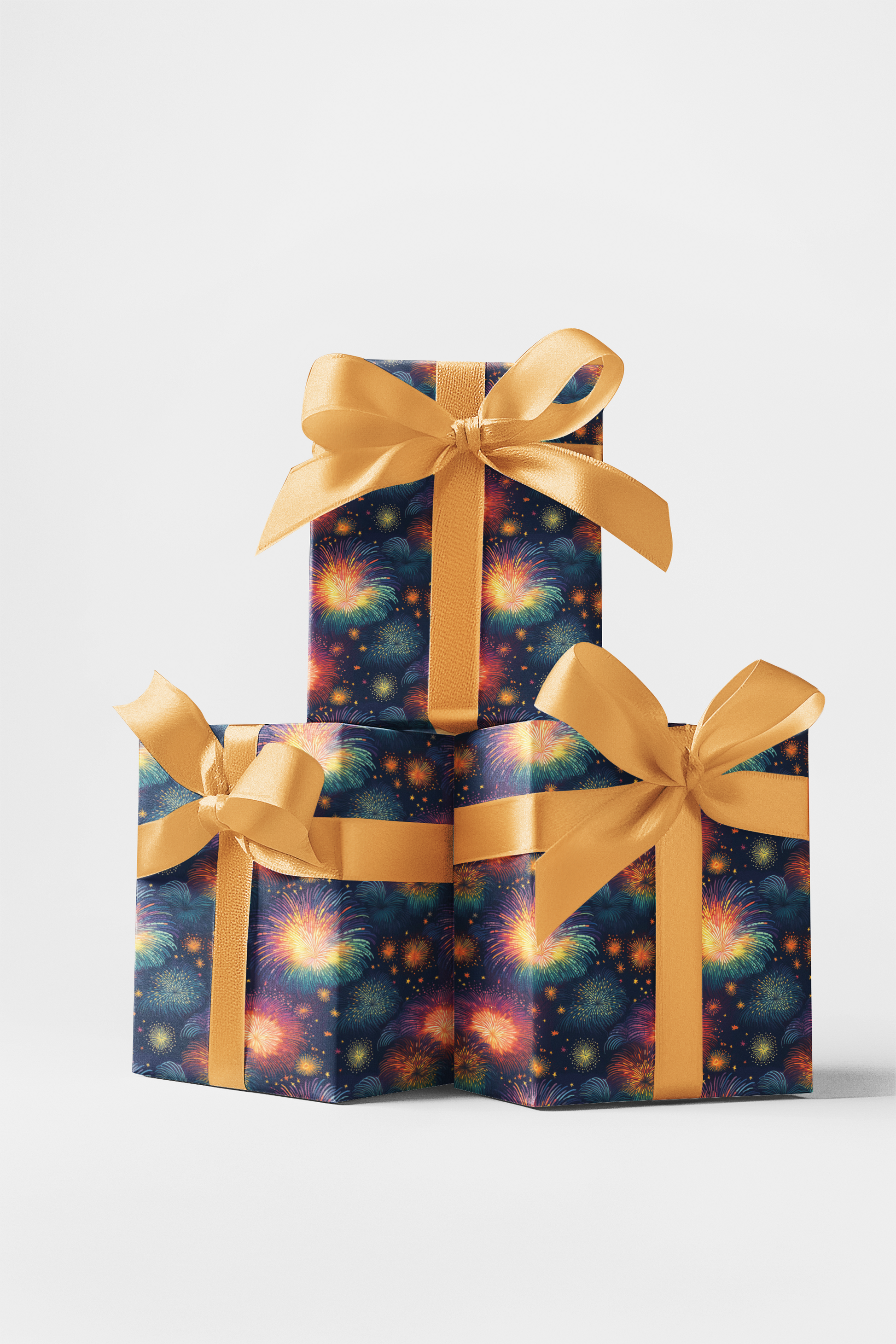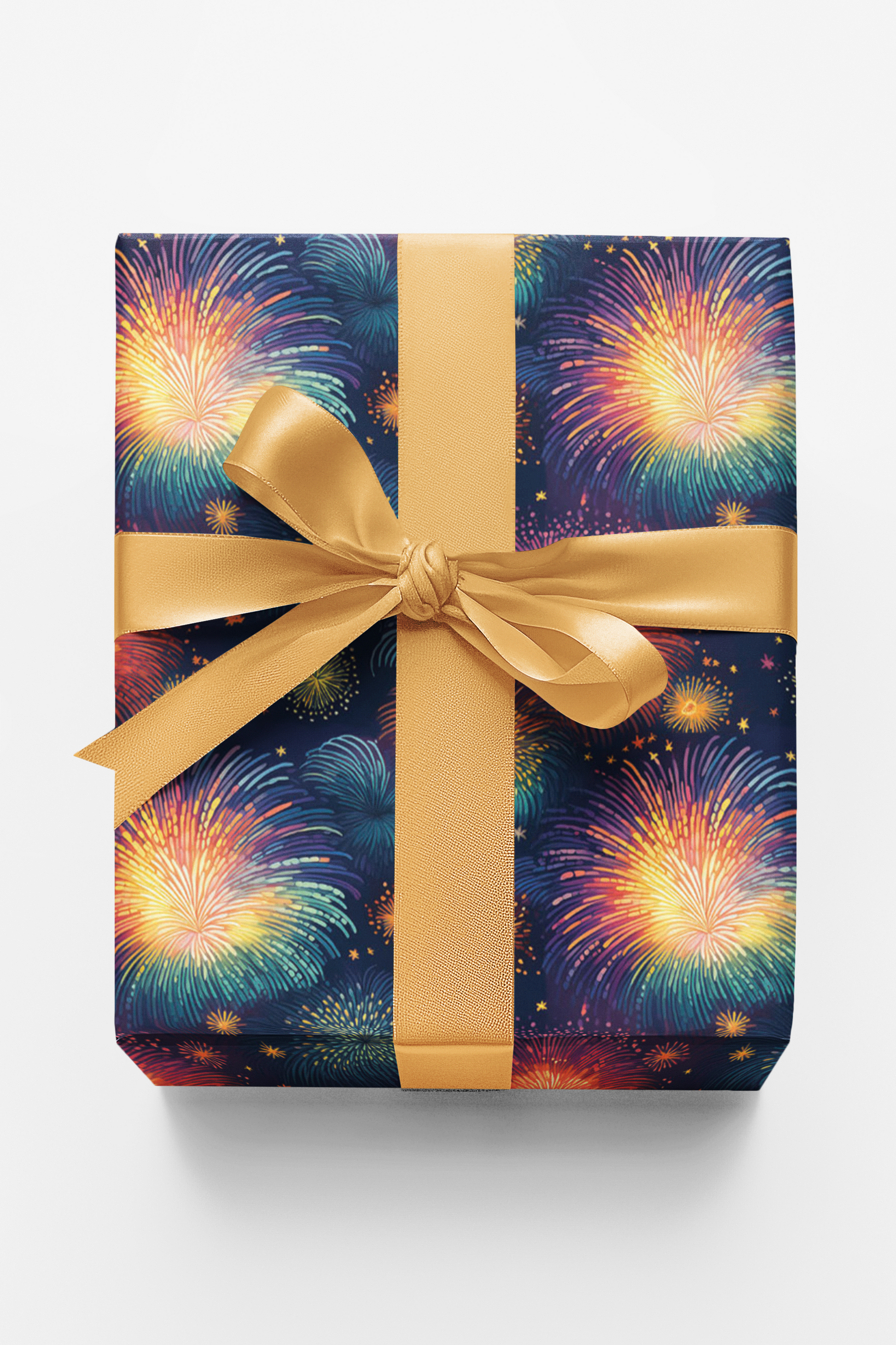 Make your gift presentation an explosive event with our Vivid Starburst Sky wrapping paper! This dynamic, seamless pattern features a dense display of vibrant starburst fireworks in rich, saturated colors, including yellow, orange, teal, magenta, and deep blue. The artistic style gives the bursts a wonderful, textured glow against the dark, midnight sky background. It is the perfect choice for celebrating New Year's Eve, Fourth of July (4th of July), birthdays, graduations, anniversaries, or any big occasion that deserves a celebratory, joyful, and visually stunning wrap.