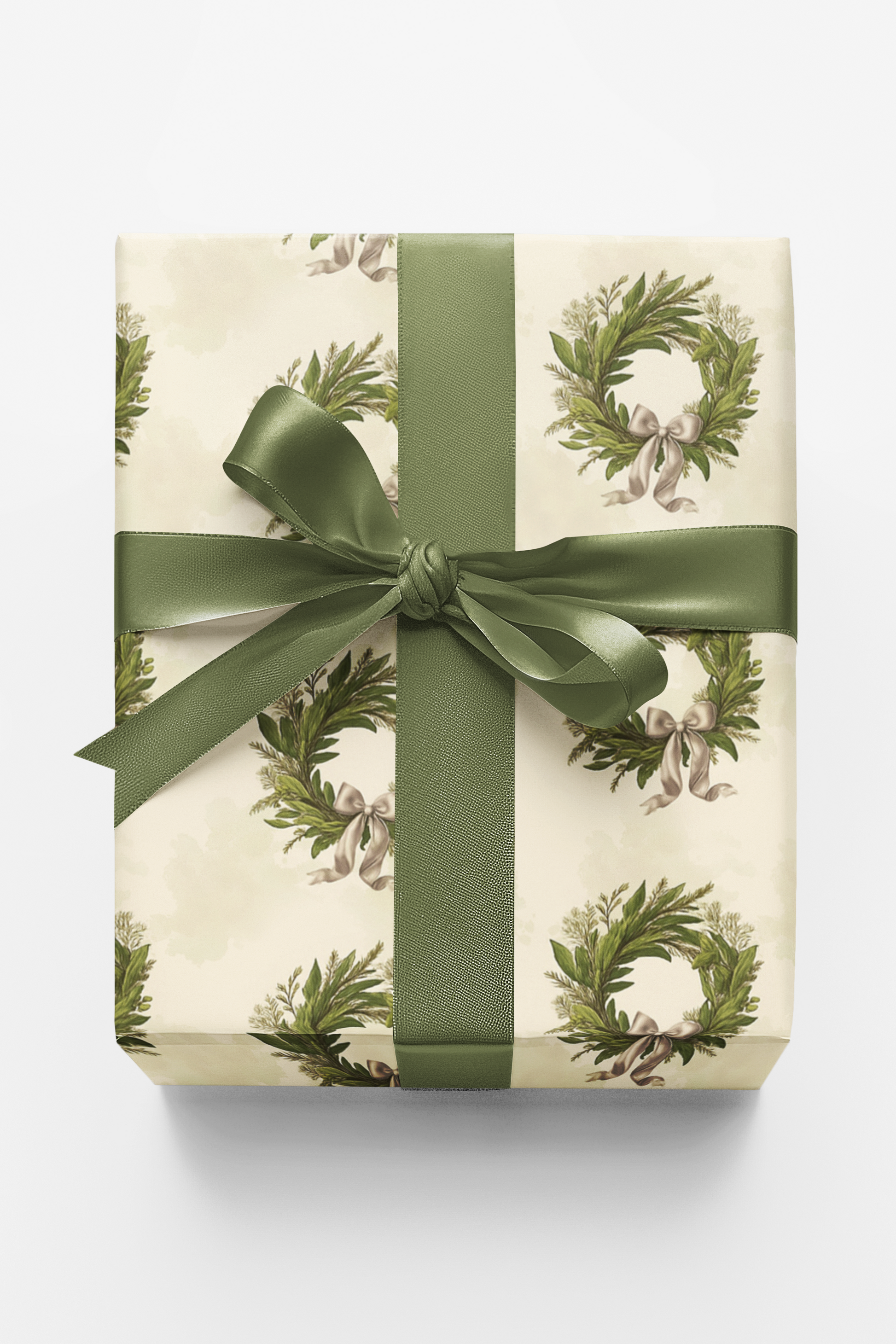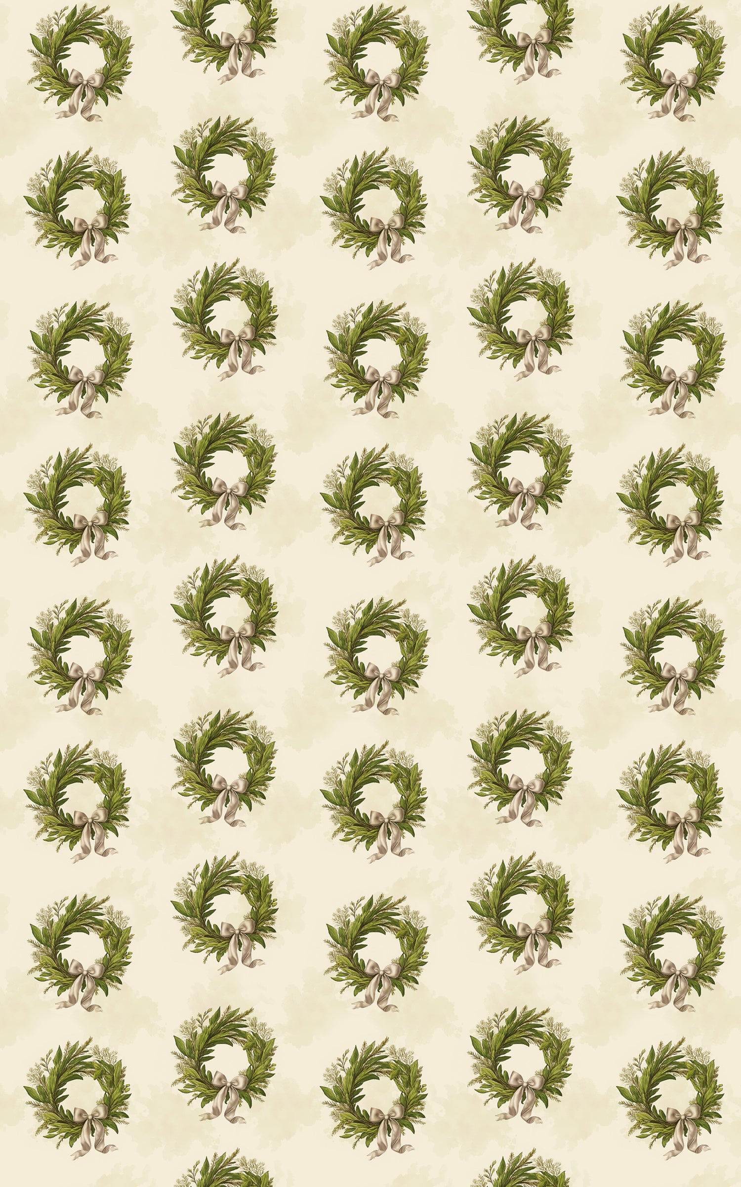 Gracefully arranged against a warm, creamy backdrop, these elegant wreaths bloom with soft greenery and delicate sprigs, each tied with a flowing ribbon that feels timeless and refined. The watercolor textures give every leaf a gentle depth, creating a design that exudes understated holiday charm. It’s a celebration of classic beauty—calm, natural, and effortlessly sophisticated. Every fold of this pattern feels like an invitation to a peaceful winter gathering, where tradition is honored and elegance shines in every carefully tied bow.