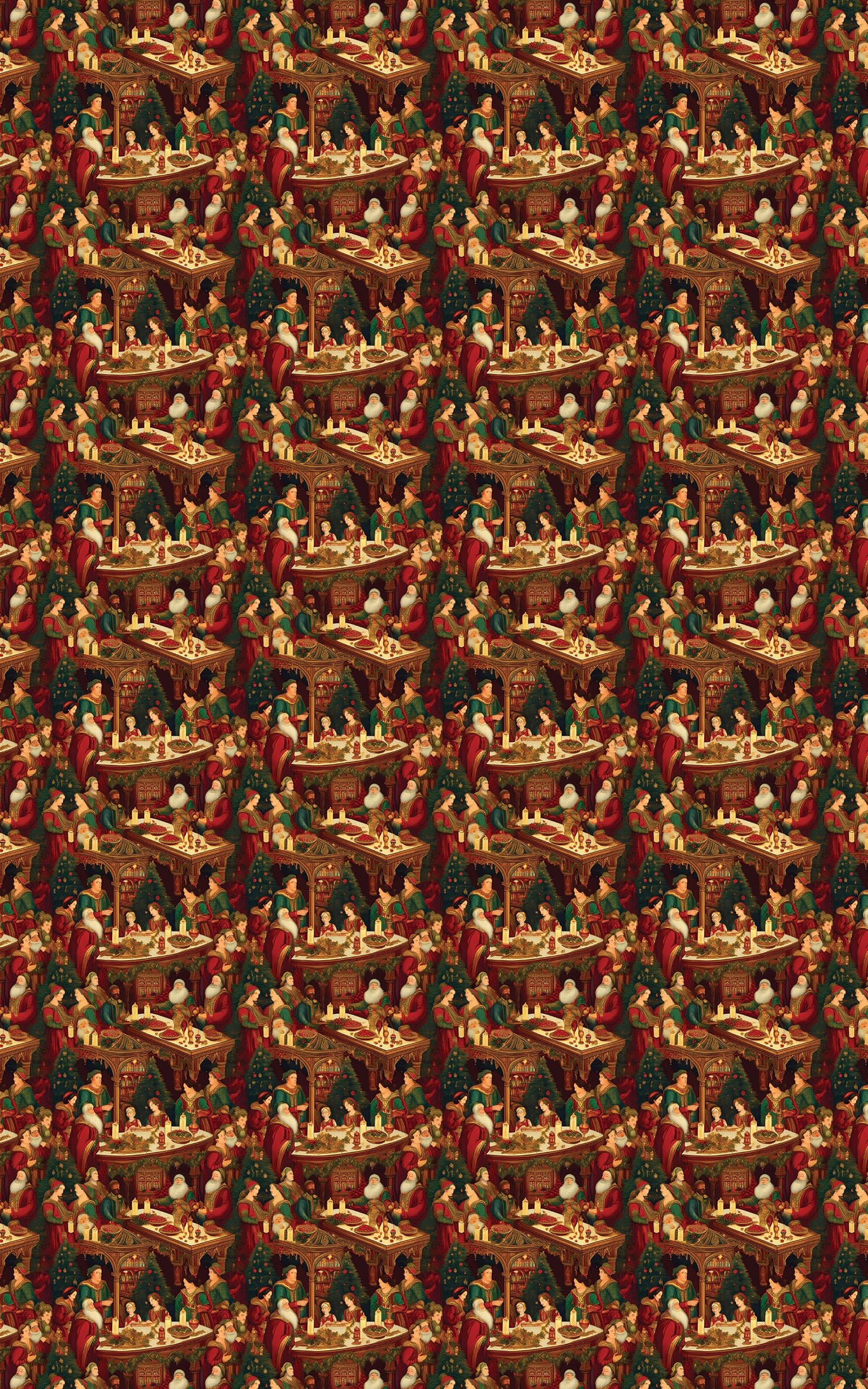 Celebrate classic holiday elegance with Yuletide Tapestry, an ornate Christmas pattern featuring festive gatherings, rich emerald and ruby tones, and warm gold accents. Perfect for sophisticated holiday decor, apparel, and gifts.